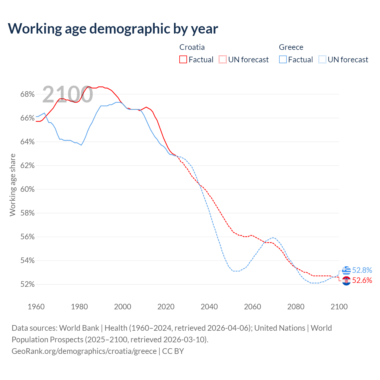 - Croatia has 2.4M working age adults (aged 15-64) vs 6.4M in Greece.