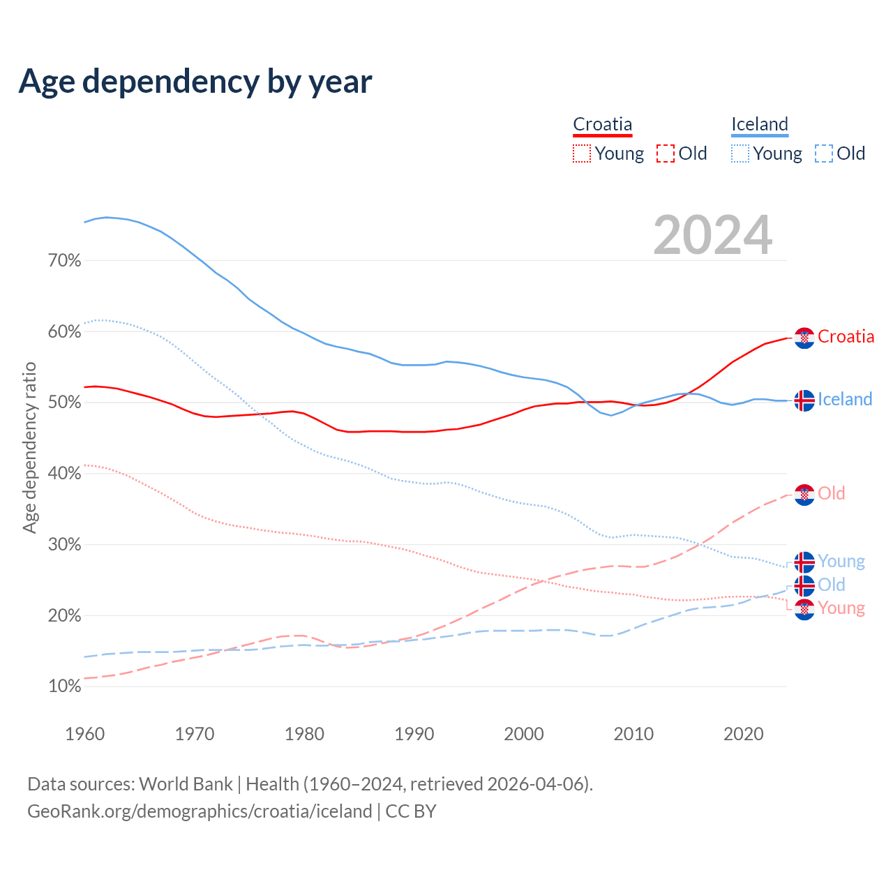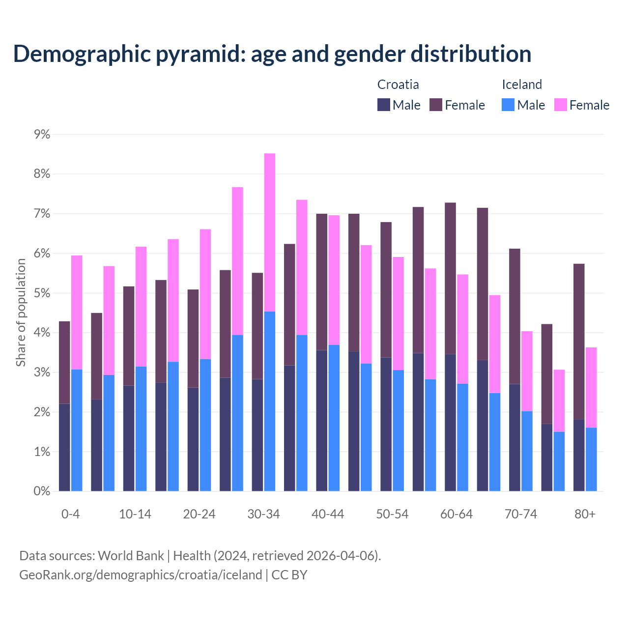 - Croatia is ranked 11/196 by median age (oldest to youngest) vs 65/196 for Iceland.