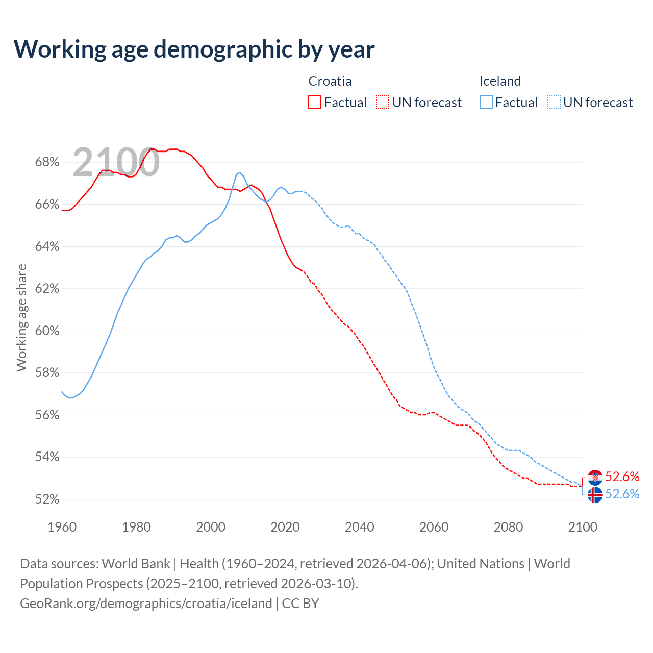 - Croatia has 2.4M working age adults (aged 15-64) vs 264K in Iceland.