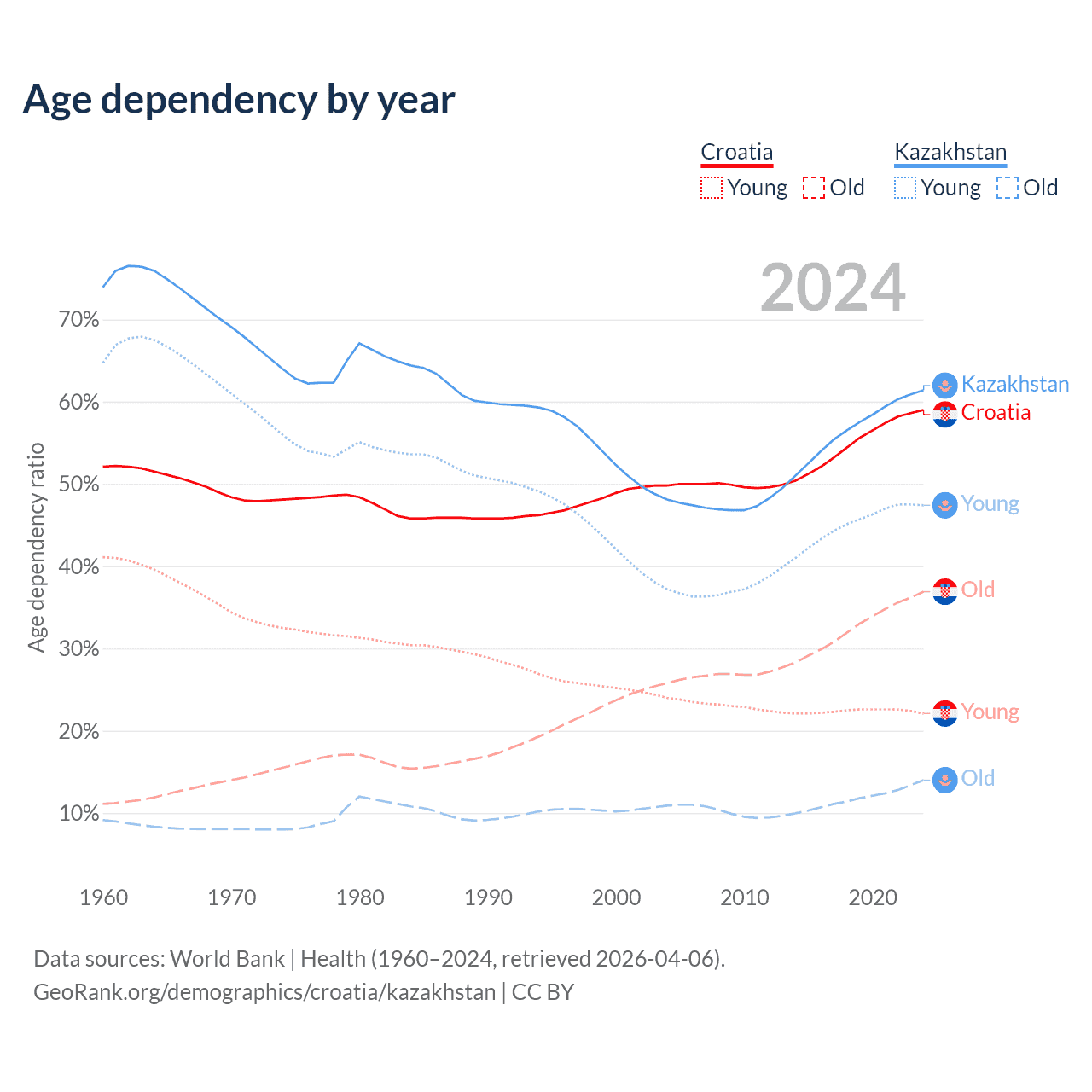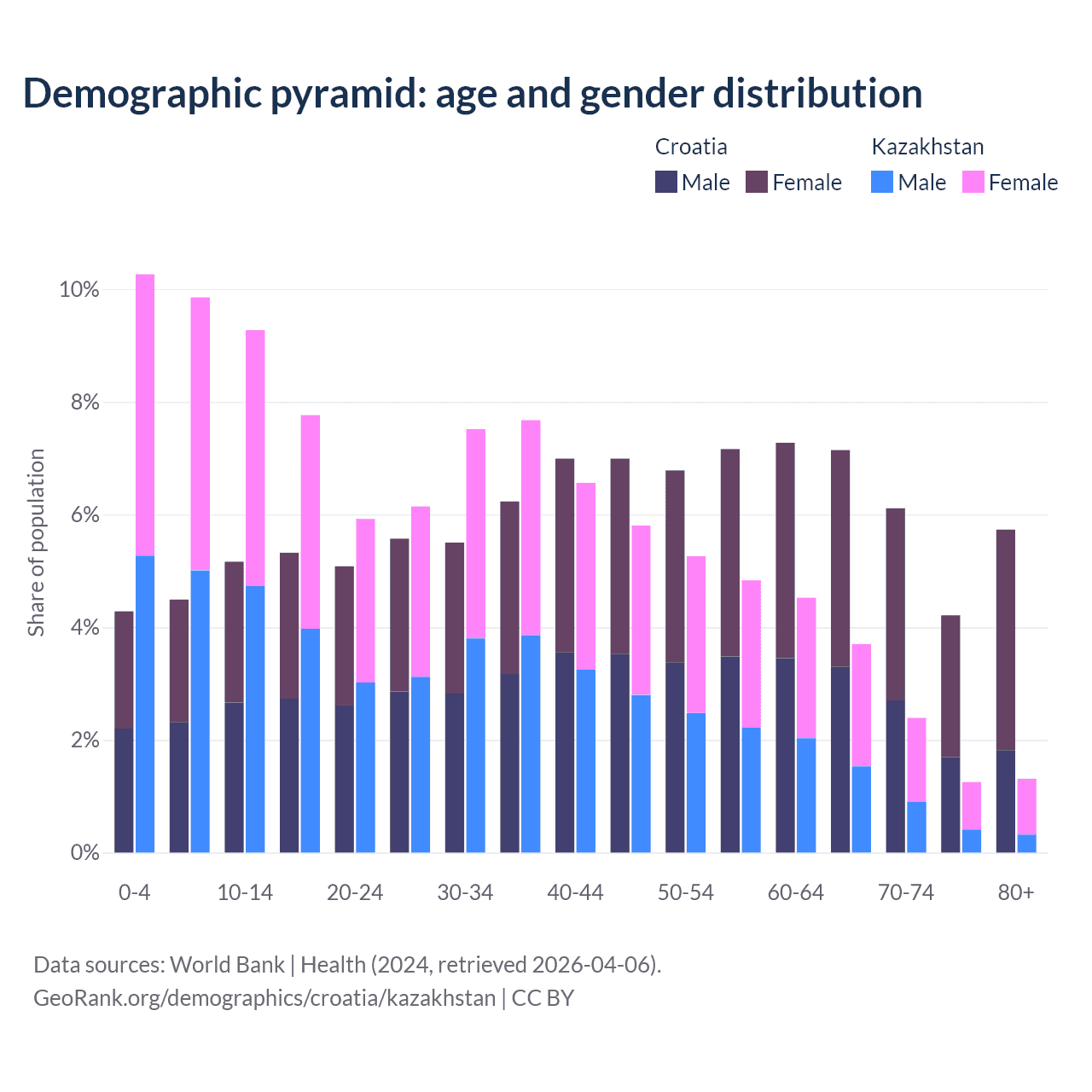 - Croatia is ranked 11/196 by median age (oldest to youngest) vs 99/196 for Kazakhstan.