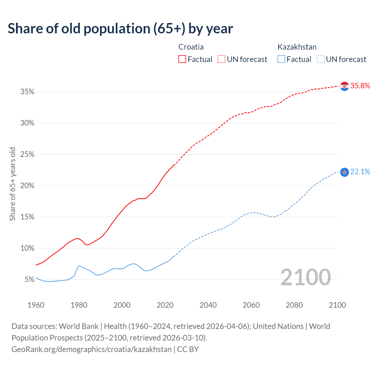 The share of older people aged 65 and over is 23.2% in Croatia and 8.65% in Kazakhstan. Life expectancy in Croatia compared to Kazakhstan .