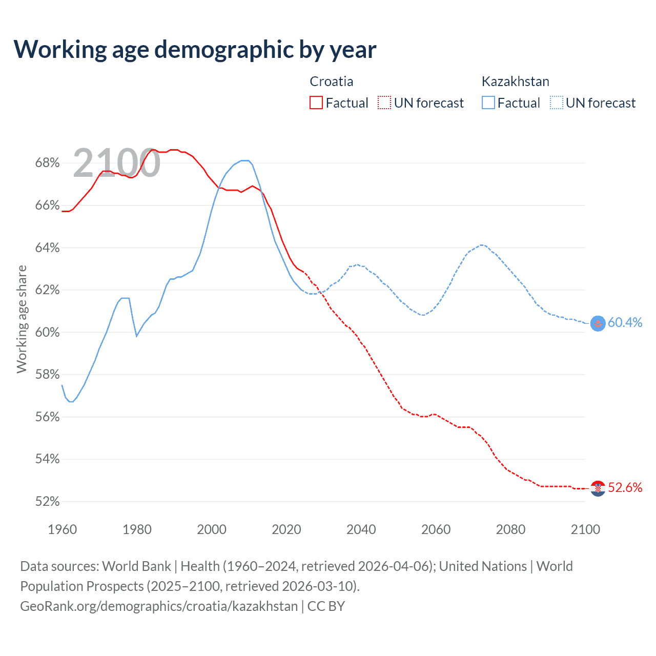 - Croatia has 2.4M working age adults (aged 15-64) vs 13.1M in Kazakhstan.