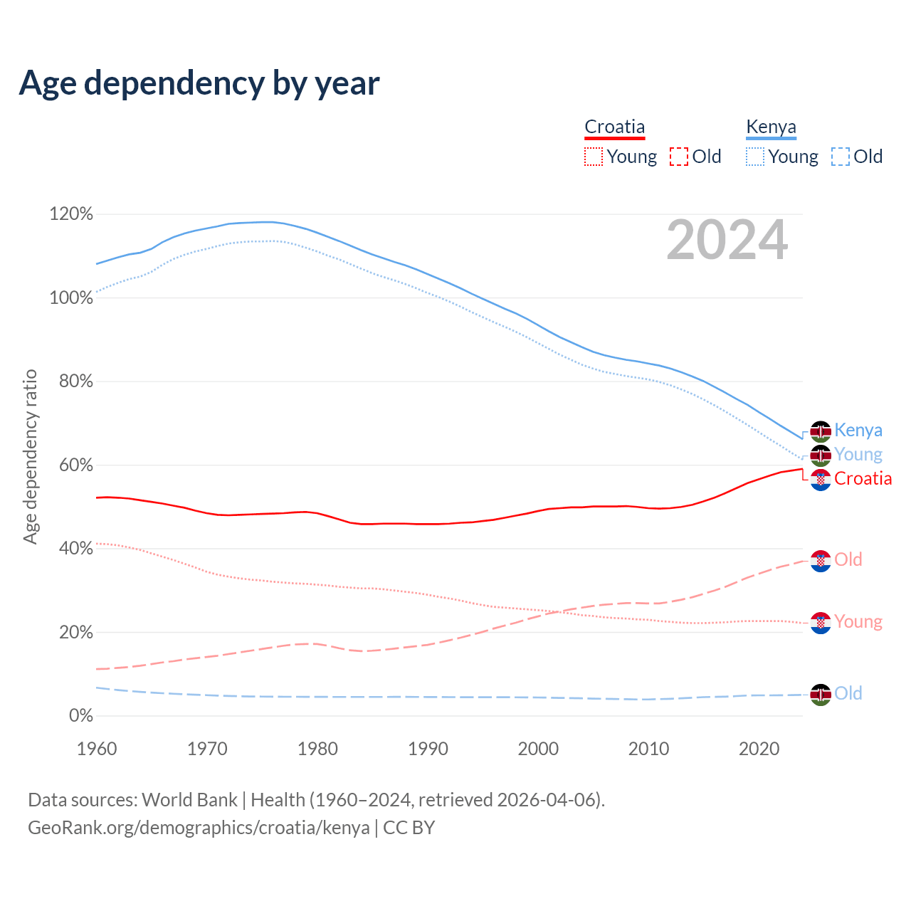 The share of older people aged 65 and over is 23.2% in Croatia and 2.97% in Kenya. Life expectancy in Croatia compared to Kenya .