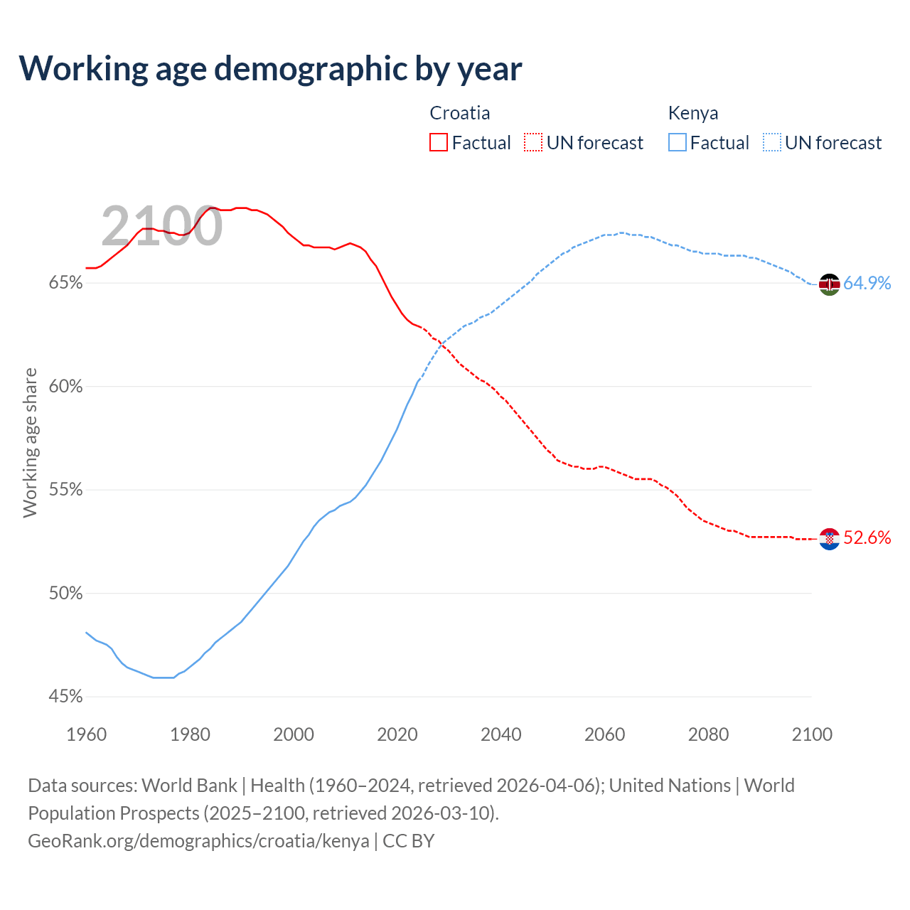 Median age Croatia vs Kenya, 1960-2100