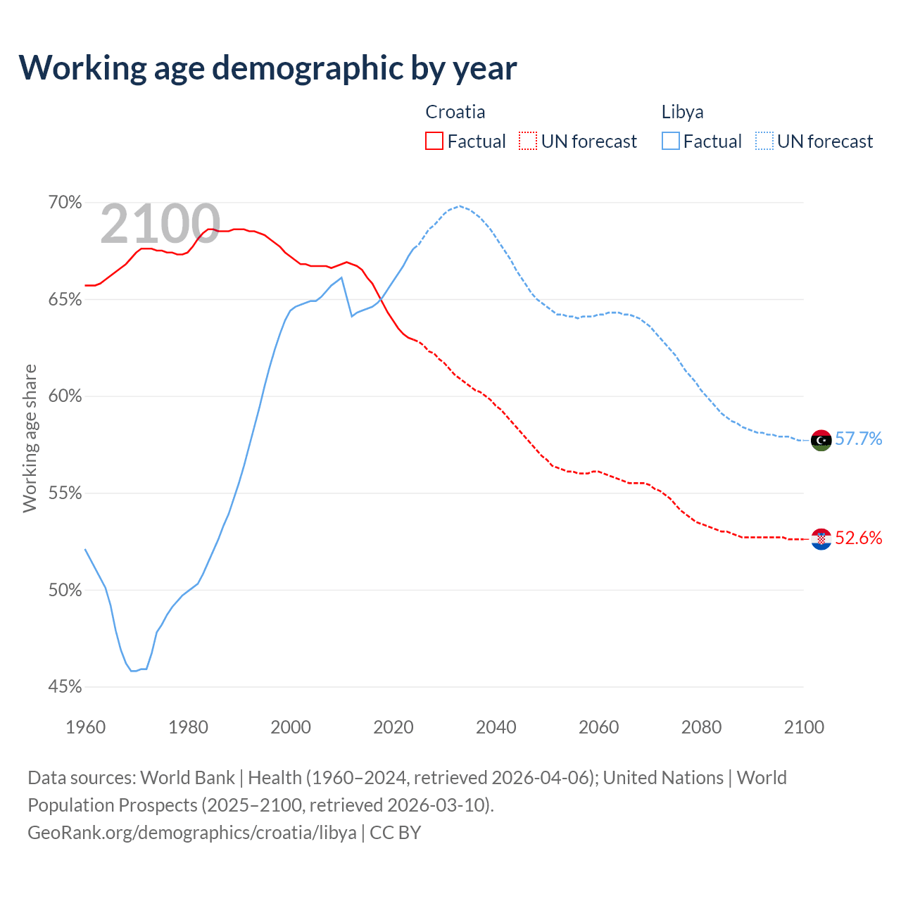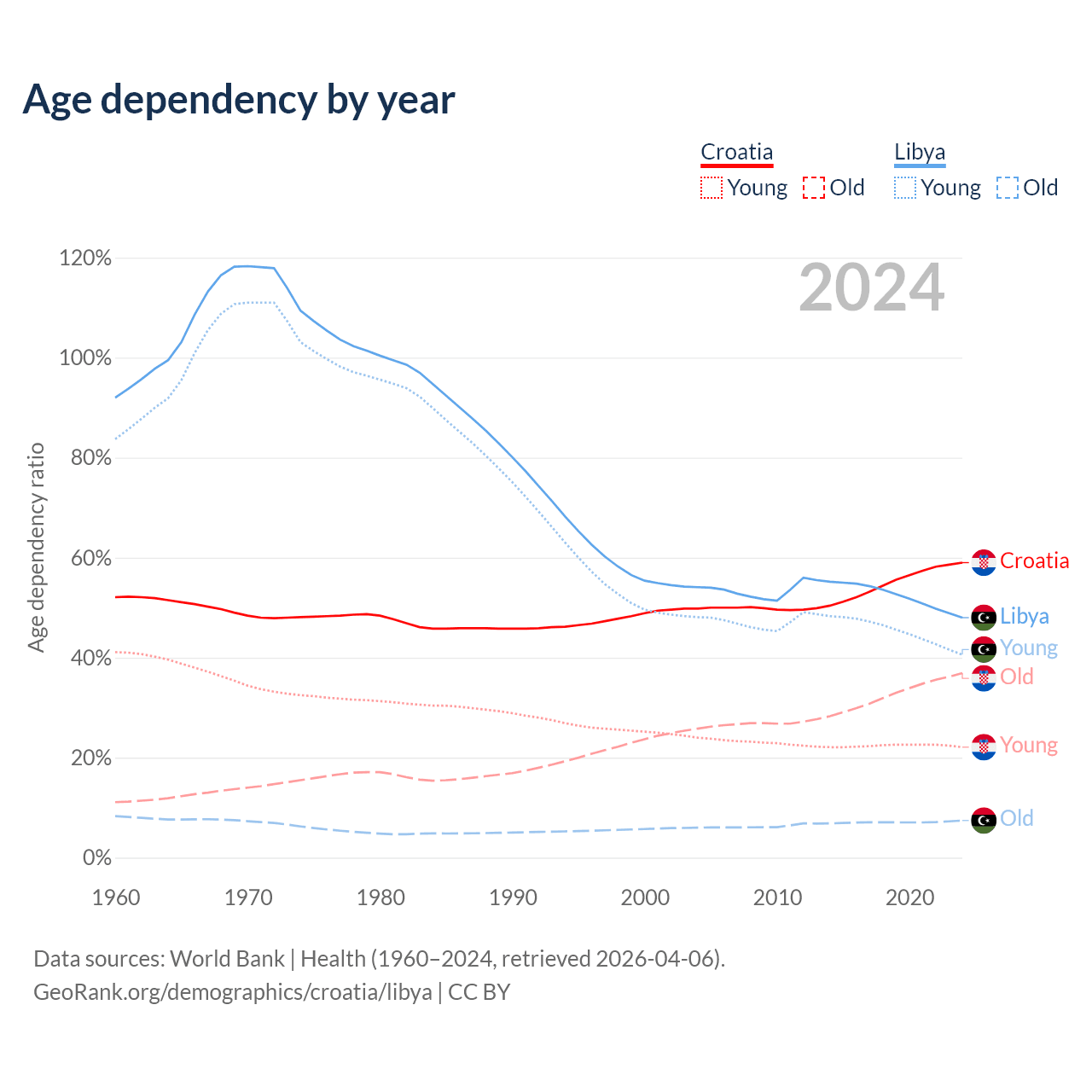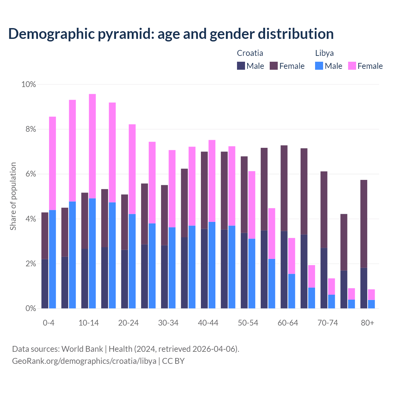 - The share of old-age demographic (65+) in Croatia is 23.2% vs 5.02% in Libya.