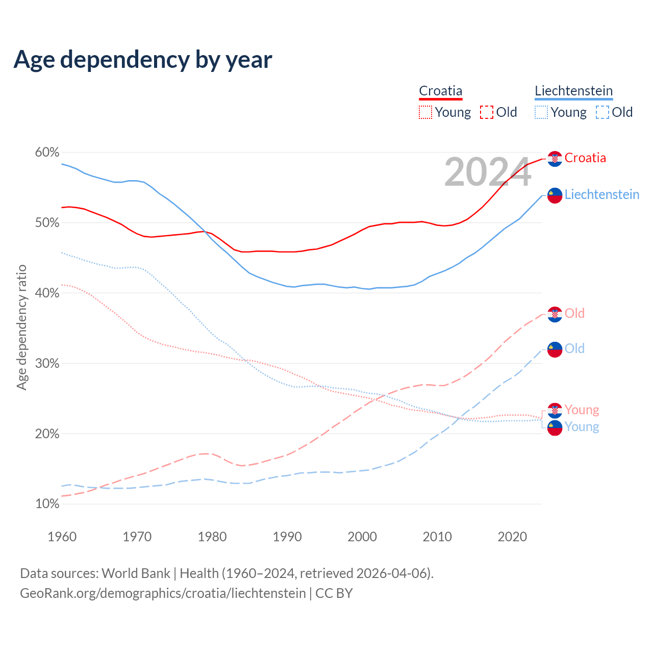 - The share of old-age demographic (65+) in Croatia is 23.2% vs 20.7% in Liechtenstein.