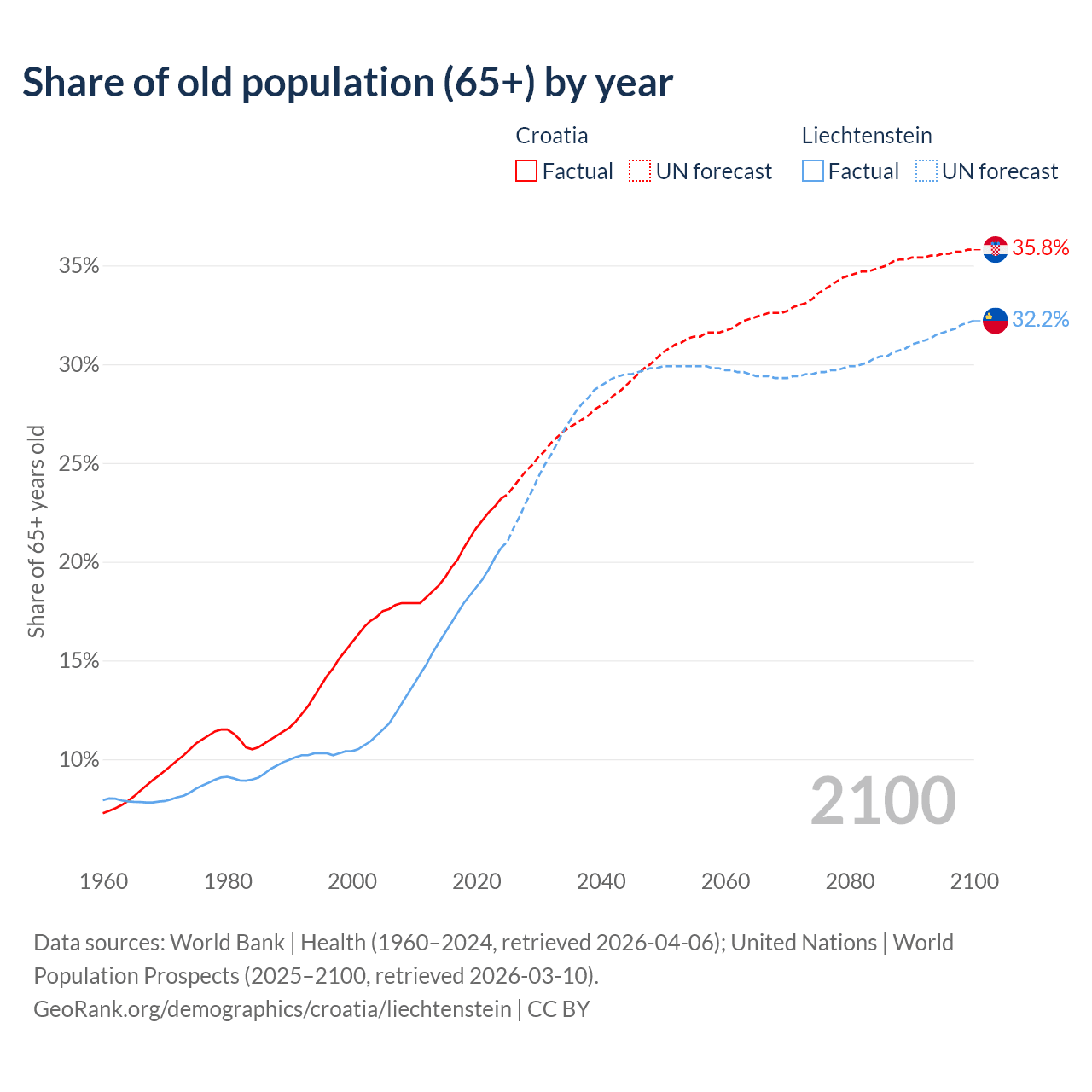 The share of older people aged 65 and over is 23.2% in Croatia and 20.7% in Liechtenstein. Life expectancy in Croatia compared to Liechtenstein .