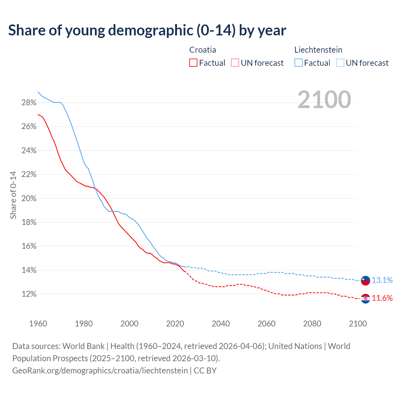 - The share of young demographic (0-15 years old) in Croatia is 13.9% vs 14.3% in Liechtenstein.