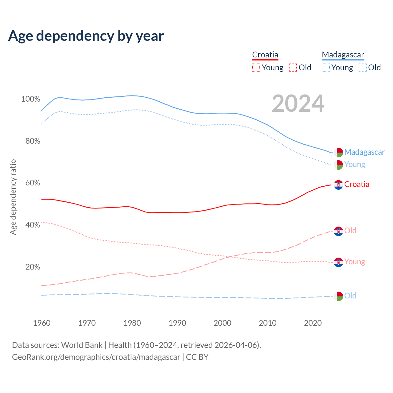 - The share of old-age demographic (65+) in Croatia is 23.2% vs 3.41% in Madagascar.