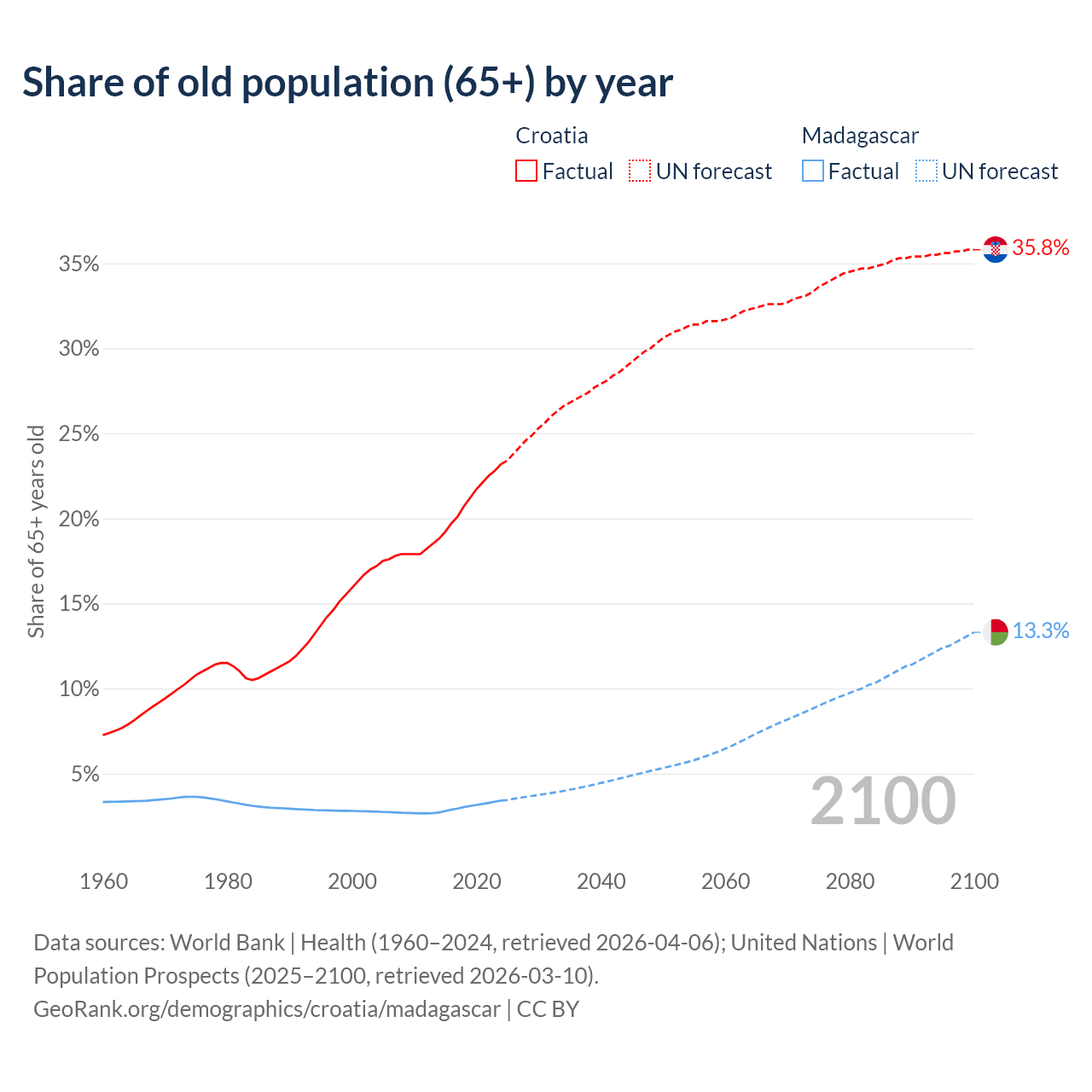 The share of older people aged 65 and over is 23.2% in Croatia and 3.41% in Madagascar. Life expectancy in Croatia compared to Madagascar .
