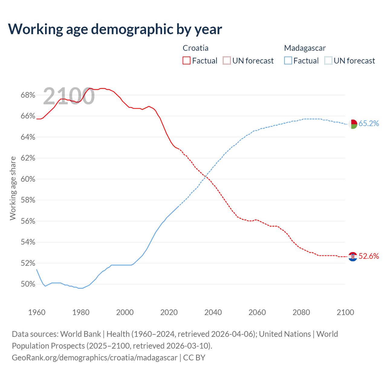 Median age Croatia vs Madagascar, 1960-2100
