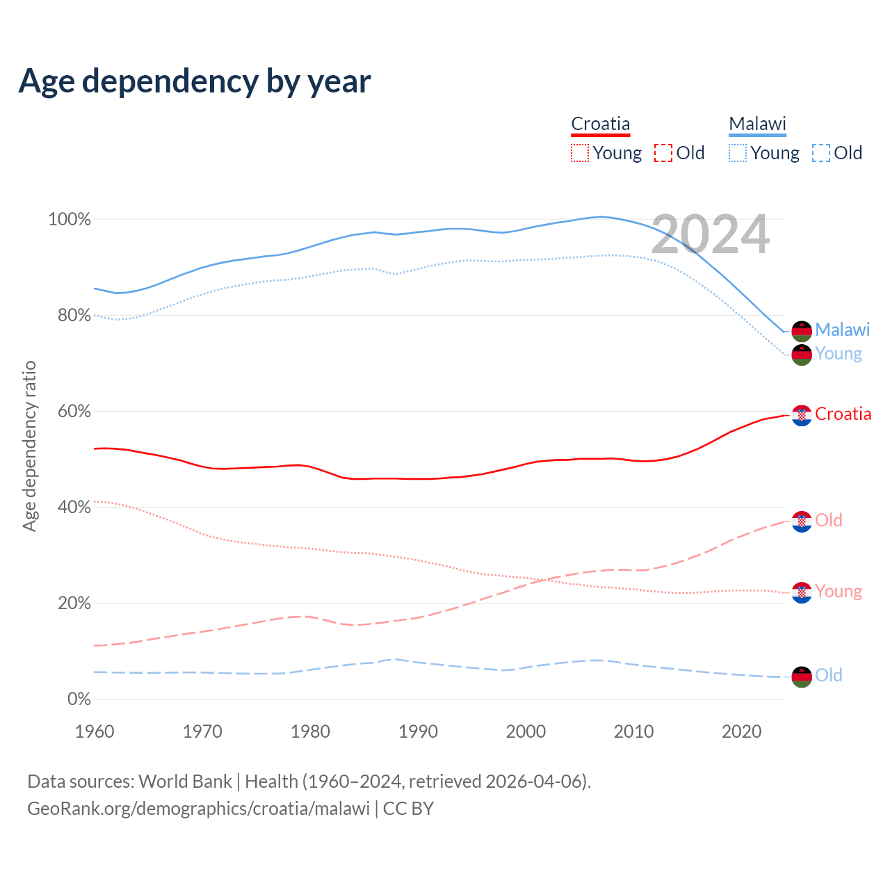 - The share of old-age demographic (65+) in Croatia is 23.2% vs 2.59% in Malawi.