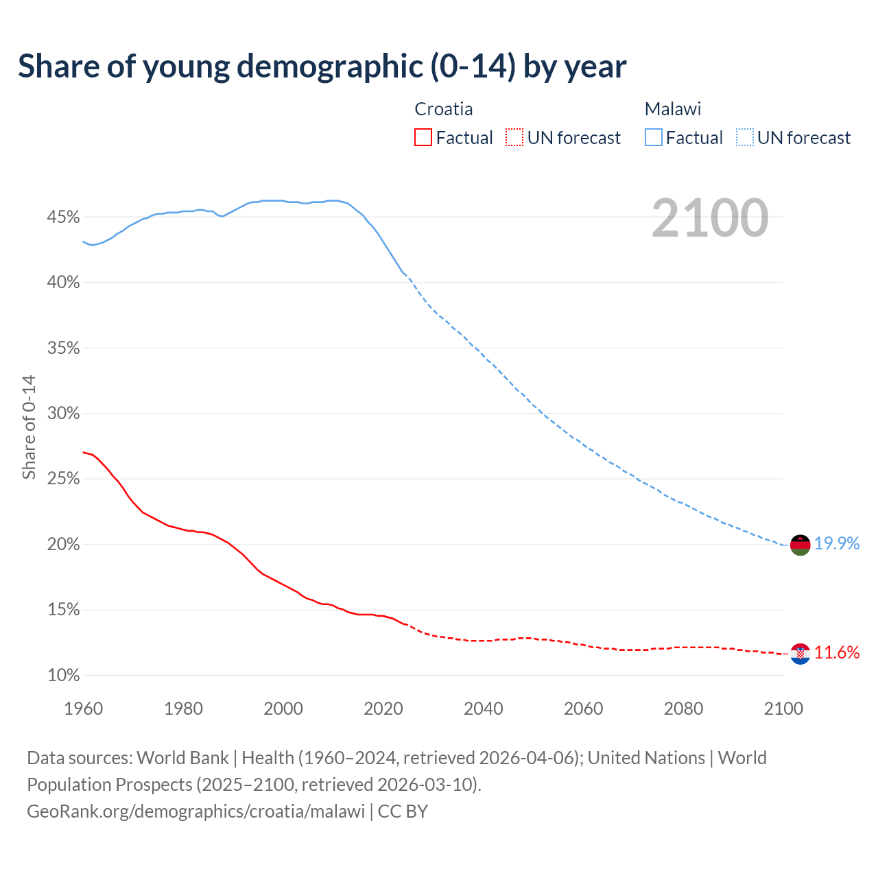 - The share of young demographic (0-15 years old) in Croatia is 13.9% vs 40.7% in Malawi.