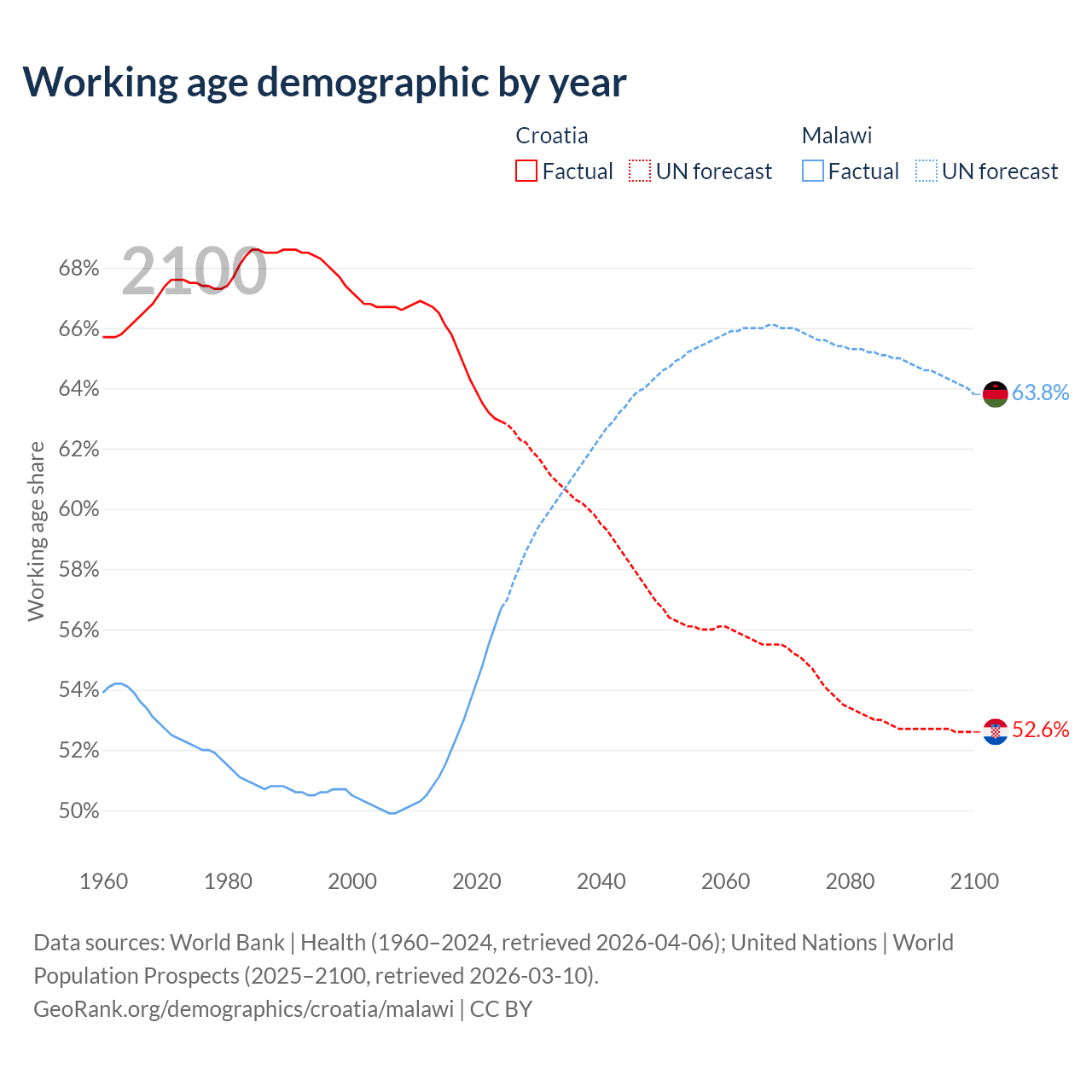 - Croatia has 2.4M working age adults (aged 15-64) vs 13M in Malawi.