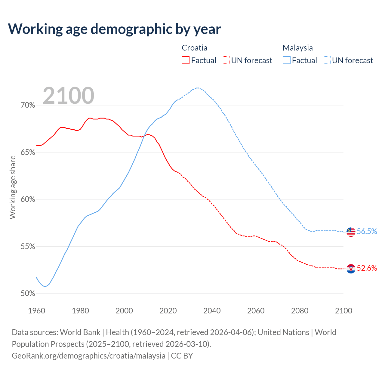 Median age Croatia vs Malaysia, 1960-2100