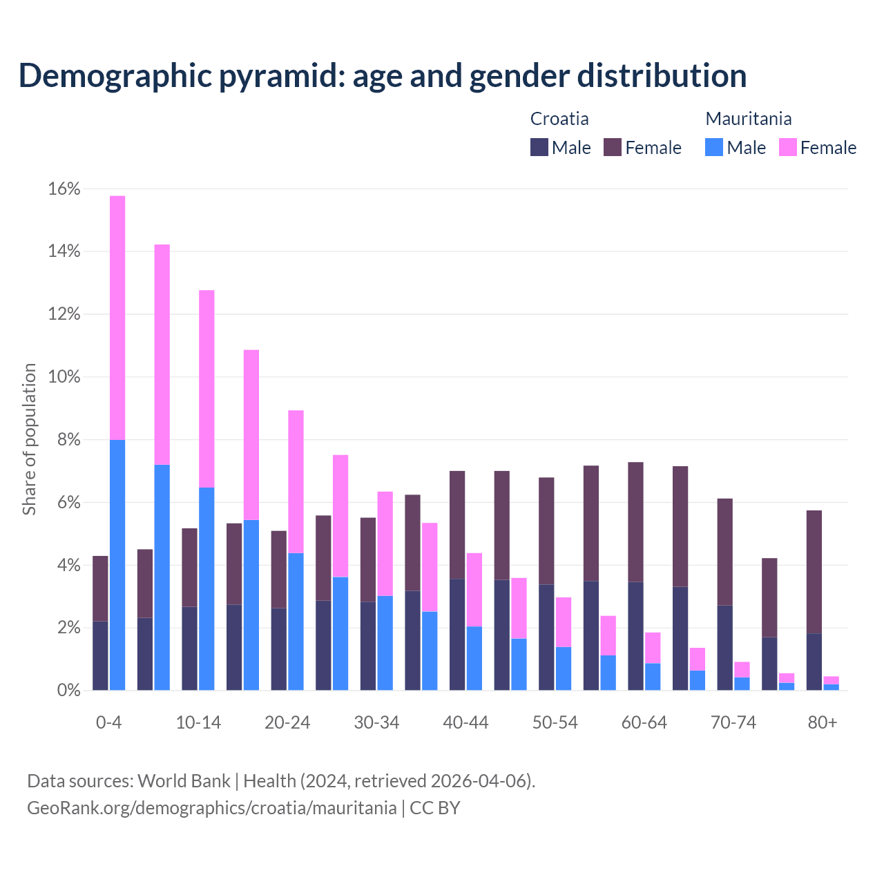 - As of 2026, the population of Croatia is 3.81M vs 5.51M in Mauritania - 1.44 times difference.