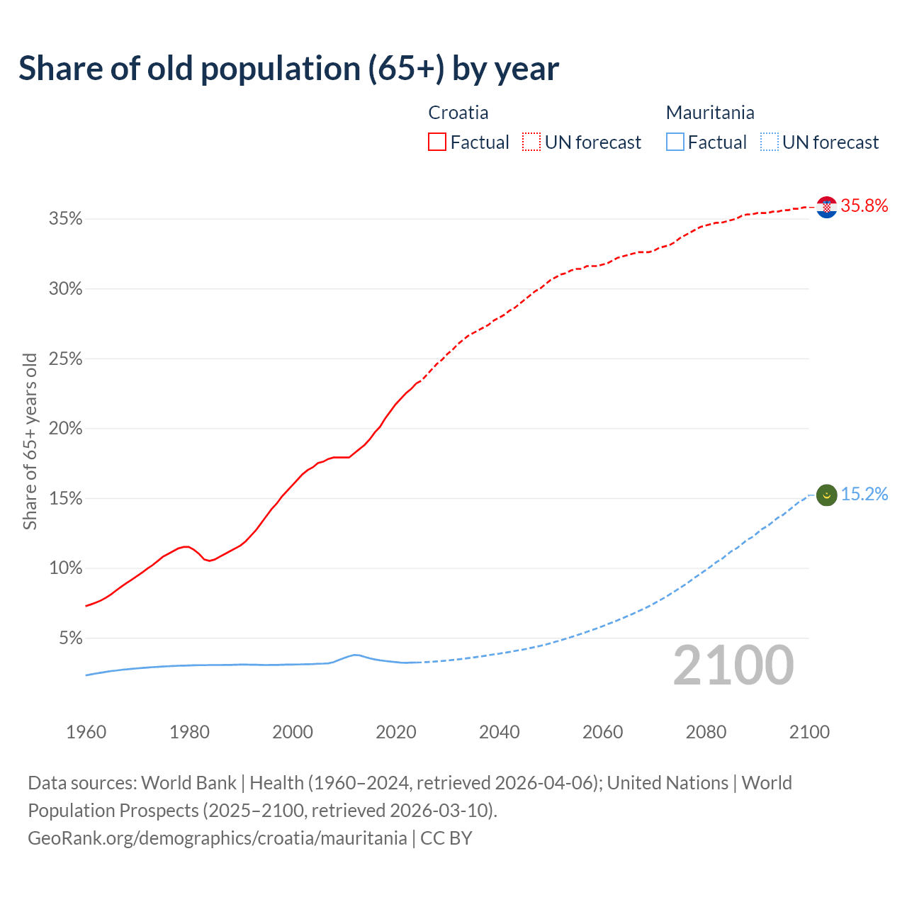 The share of older people aged 65 and over is 23.2% in Croatia and 3.23% in Mauritania. Life expectancy in Croatia compared to Mauritania .