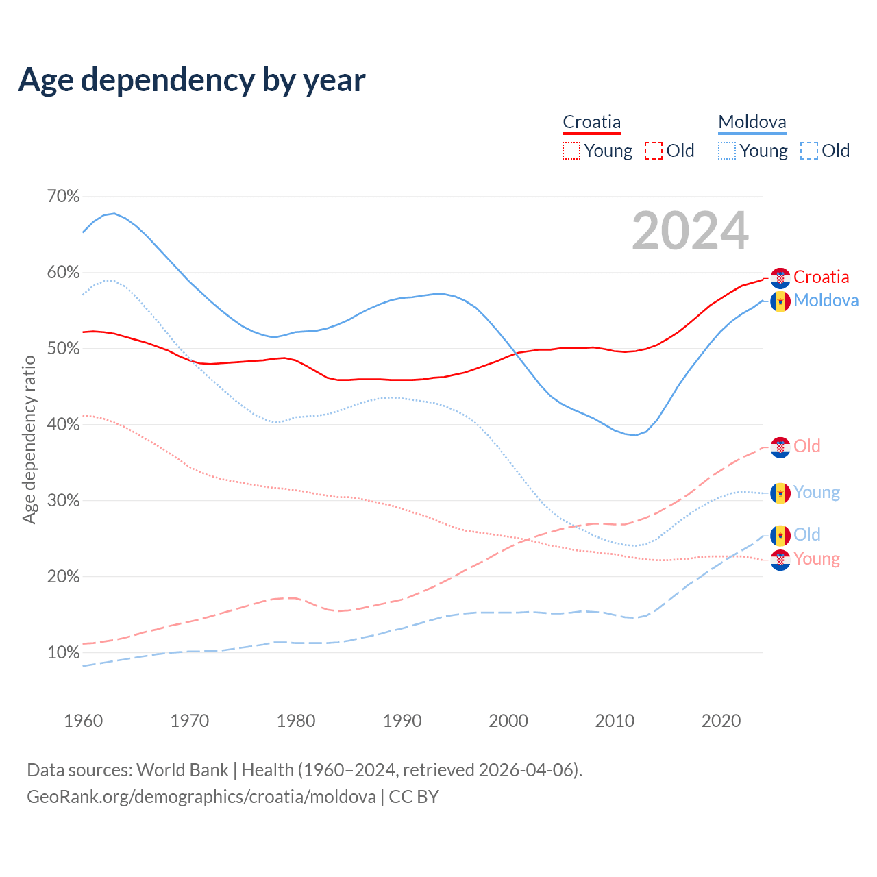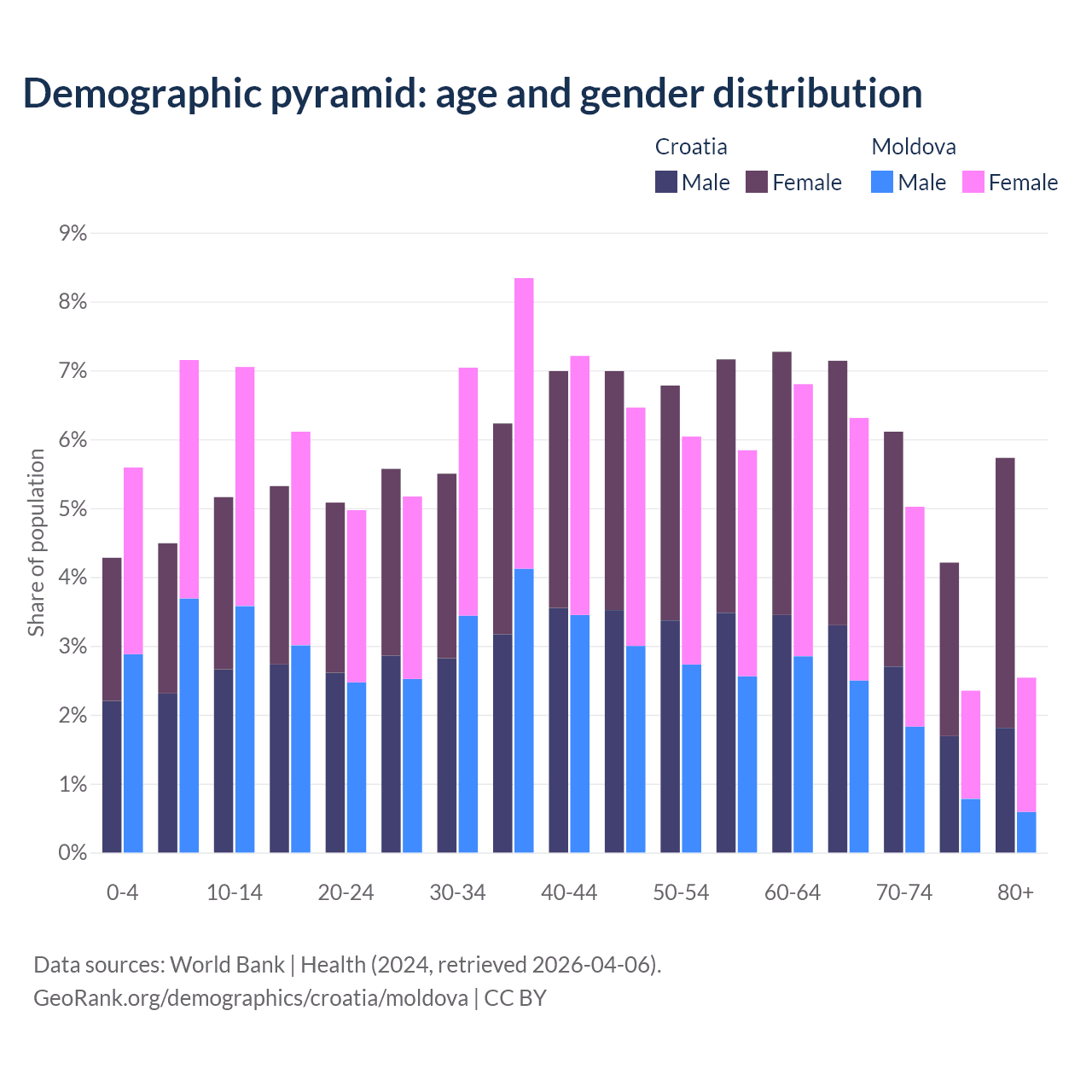 - Croatia is ranked 11/196 by median age (oldest to youngest) vs 54/196 for Moldova.