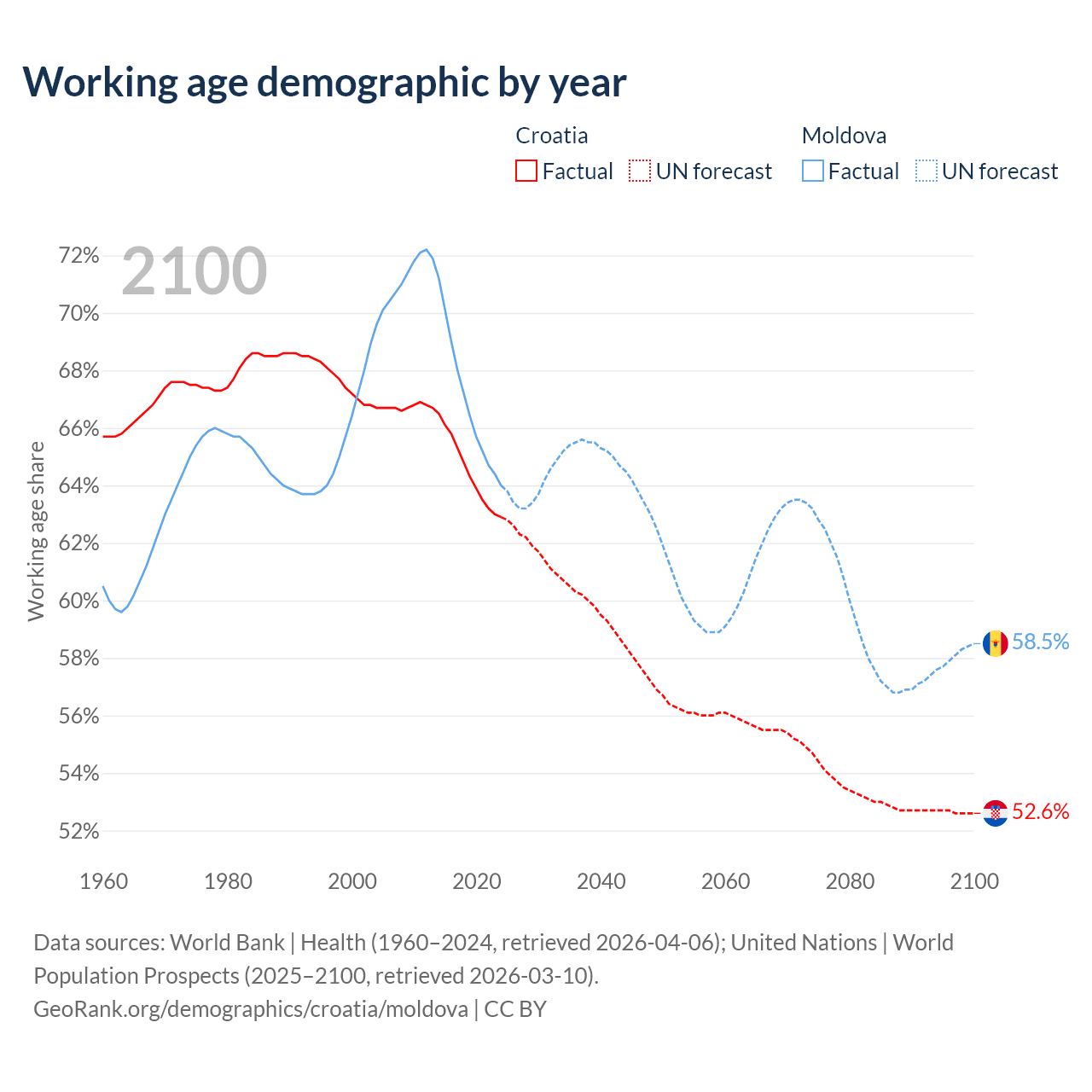 - Croatia has 2.4M working age adults (aged 15-64) vs 1.5M in Moldova.