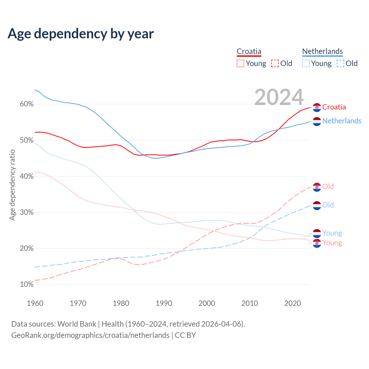 - Croatia is ranked 11/196 by median age (oldest to youngest) vs 33/196 for the Netherlands.