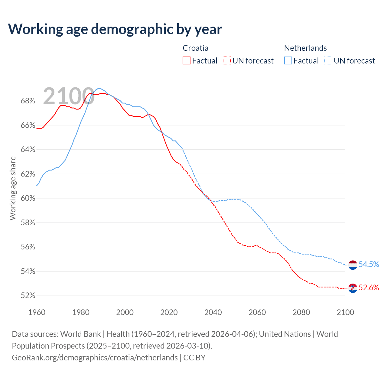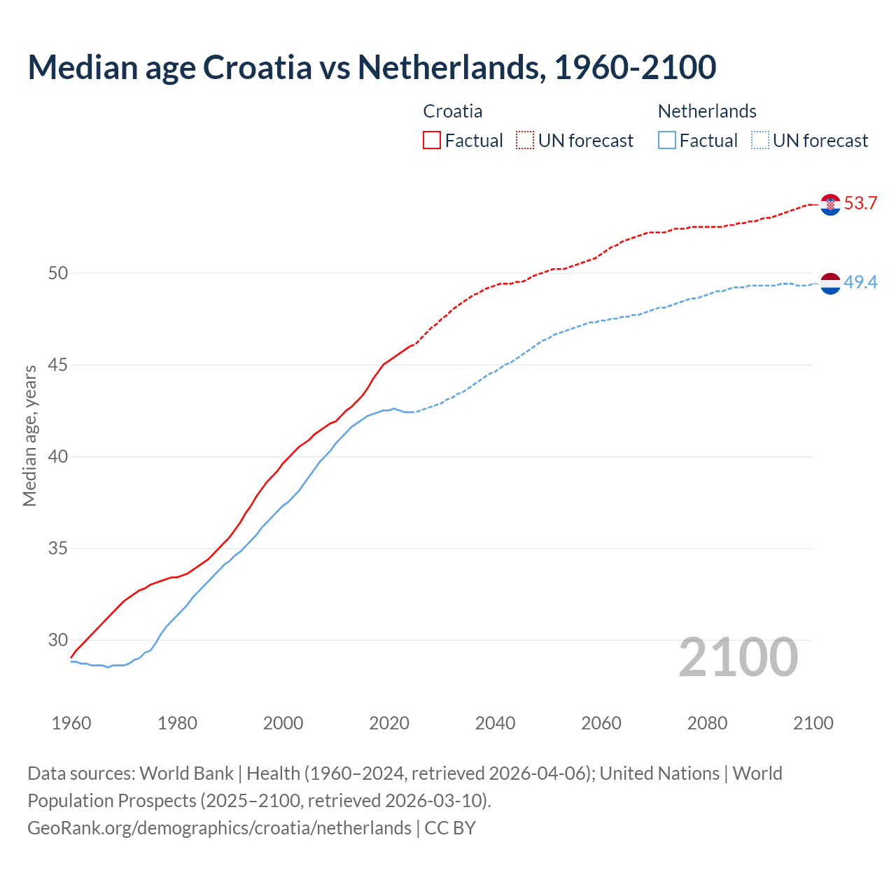 Median age Croatia vs Netherlands, 1960-2100