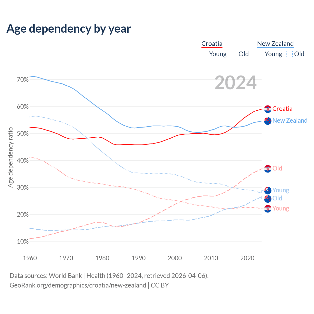 - Croatia is ranked 11/196 by median age (oldest to youngest) vs 56/196 for New Zealand.