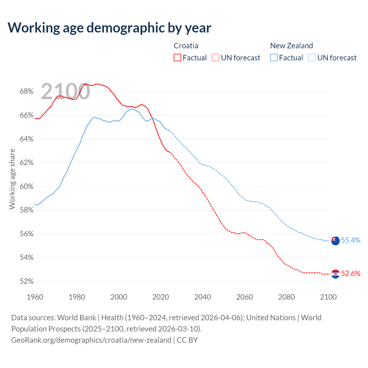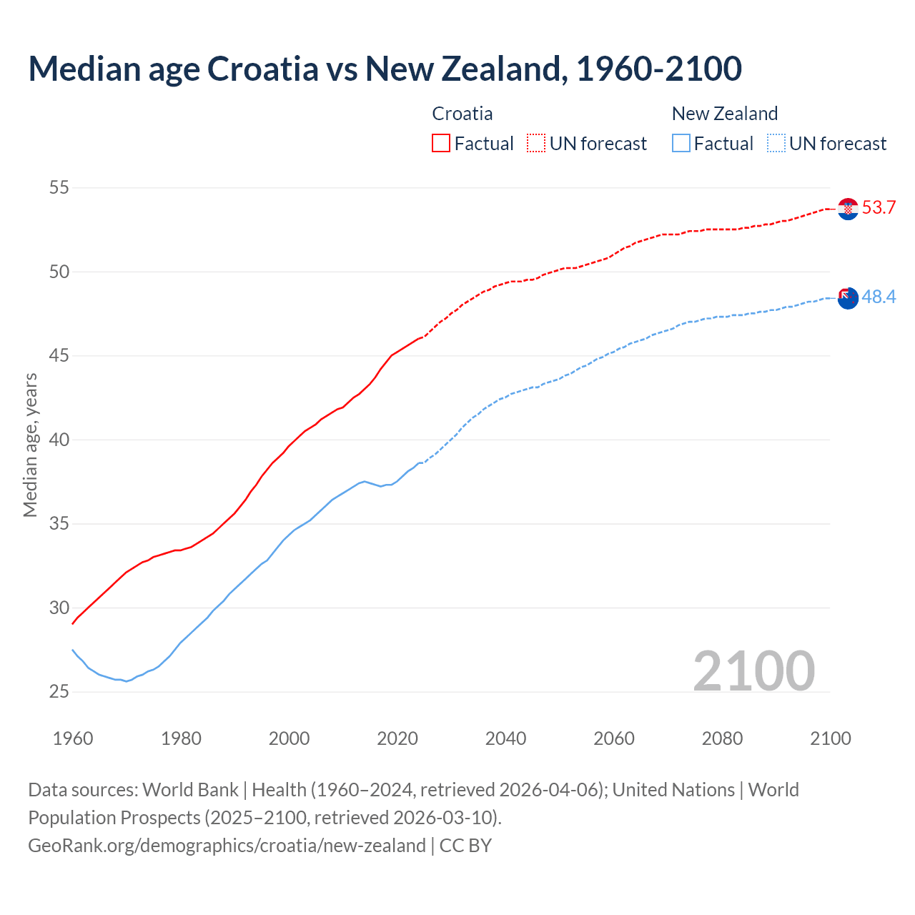 Median age Croatia vs New Zealand, 1960-2100