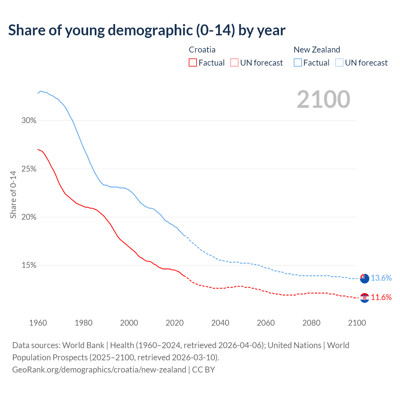 - The share of young demographic (0-15 years old) in Croatia is 13.9% vs 18.1% in New Zealand.
