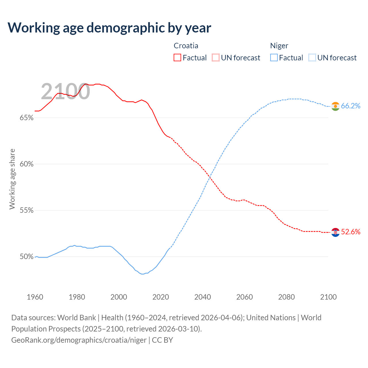 Median age Croatia vs Niger, 1960-2100