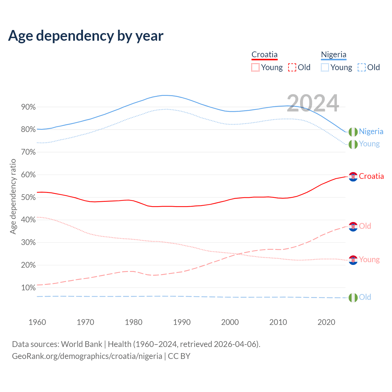 - The share of old-age demographic (65+) in Croatia is 23.2% vs 3.05% in Nigeria.