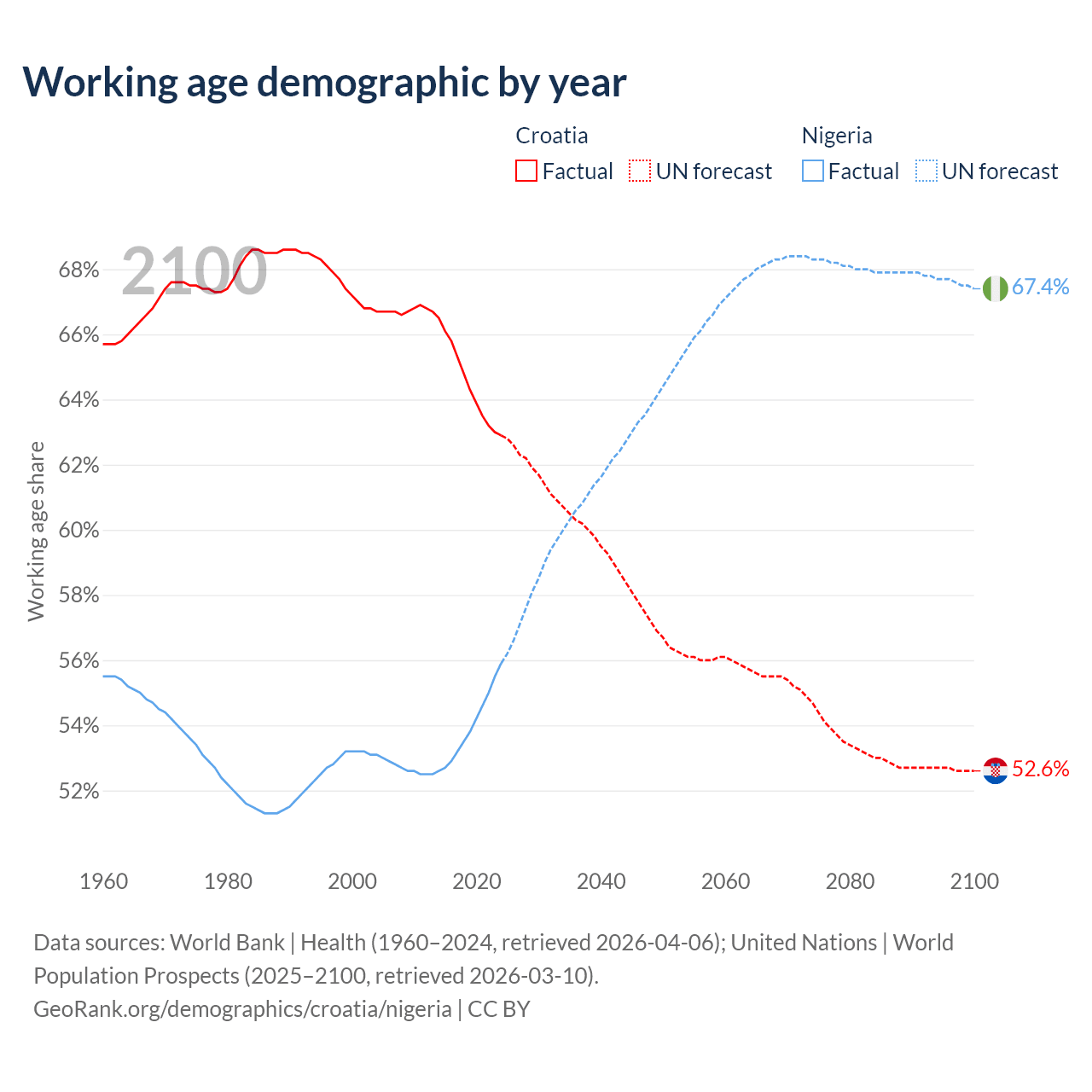 Median age Croatia vs Nigeria, 1960-2100
