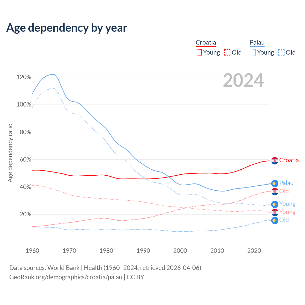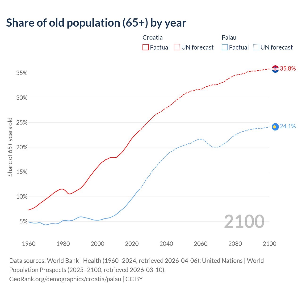 - The share of old-age demographic (65+) in Croatia is 23.2% vs 11.3% in Palau.