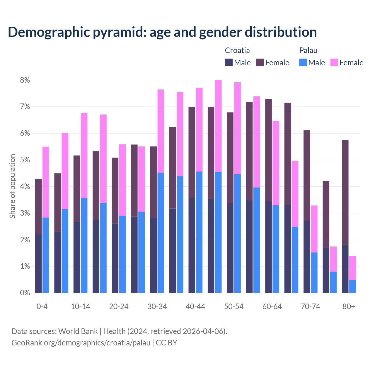 - Croatia is ranked 11/196 by median age (oldest to youngest) vs 53/196 for Palau.