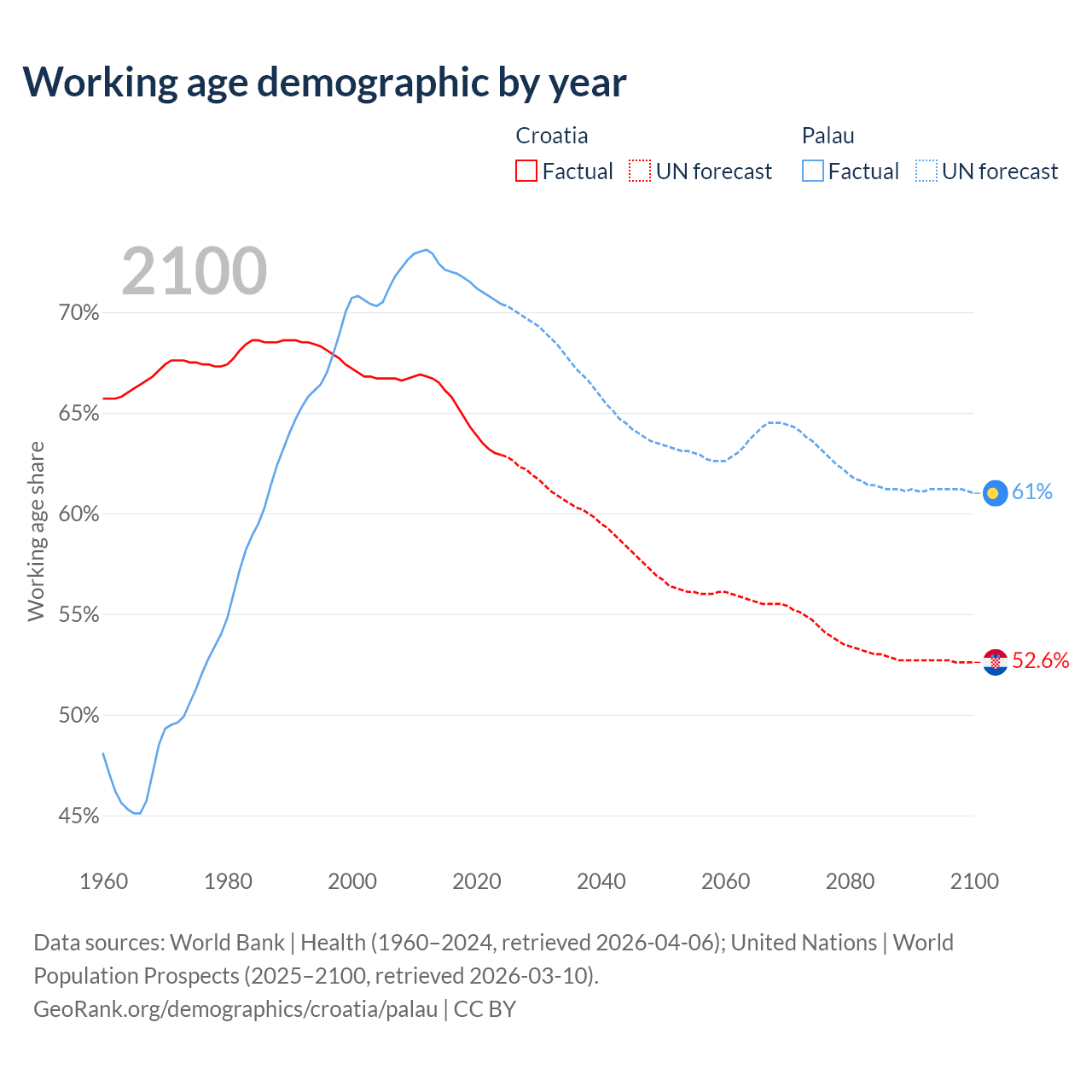 - Croatia has 2.4M working age adults (aged 15-64) vs 12.4K in Palau.