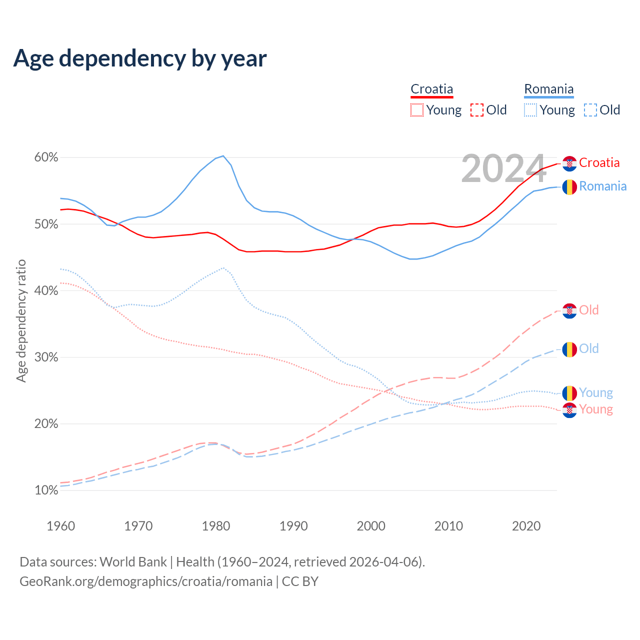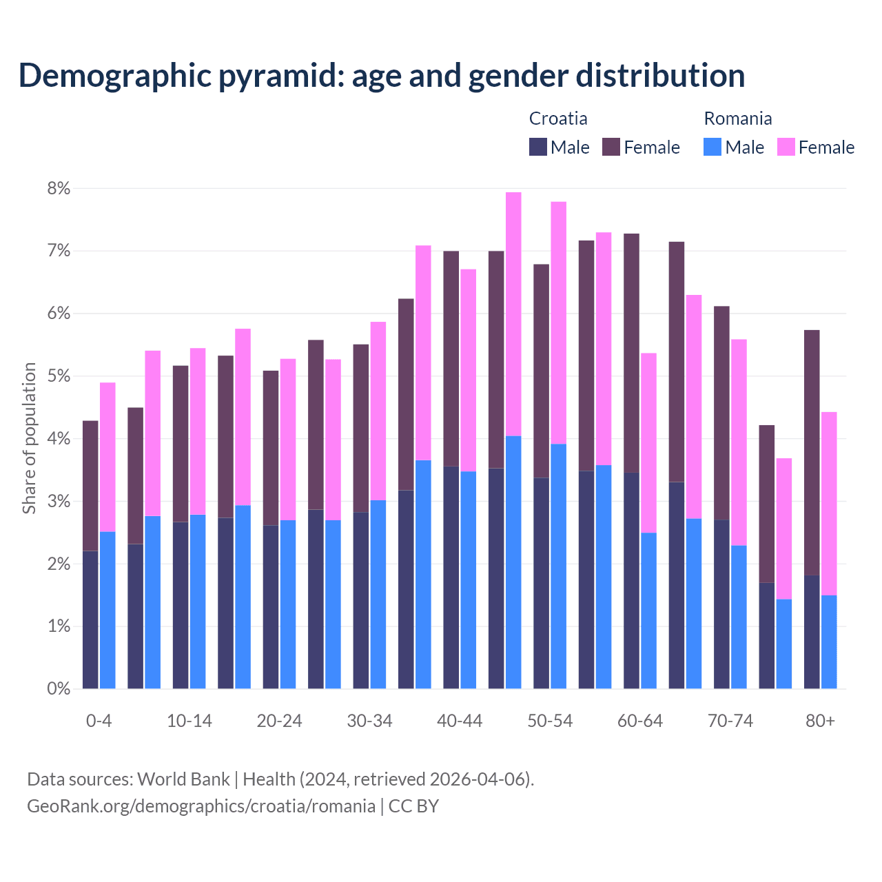 - Croatia is ranked 11/196 by median age (oldest to youngest) vs 23/196 for Romania.