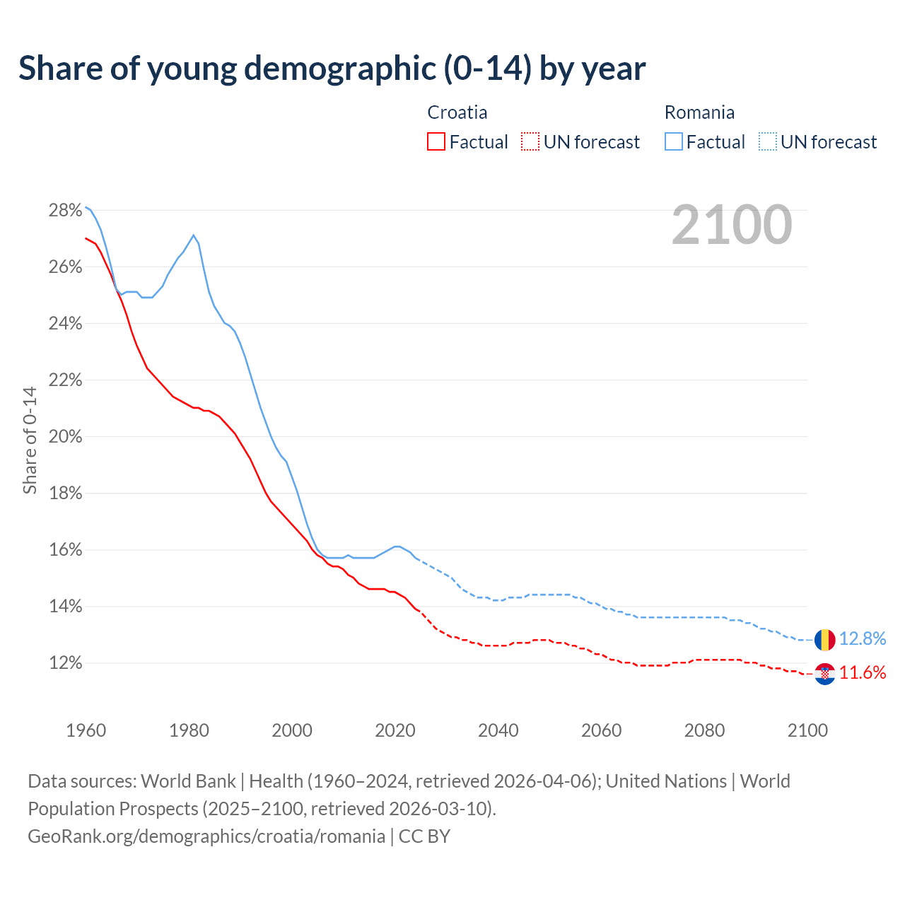 - The share of young demographic (0-15 years old) in Croatia is 13.9% vs 15.7% in Romania.