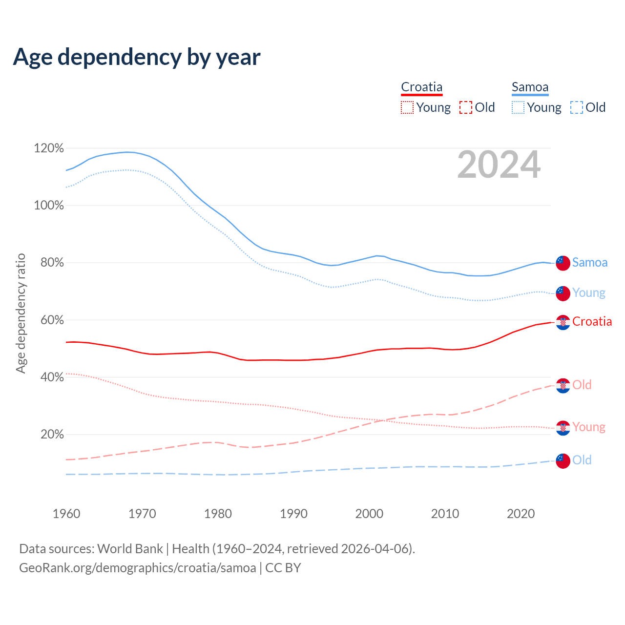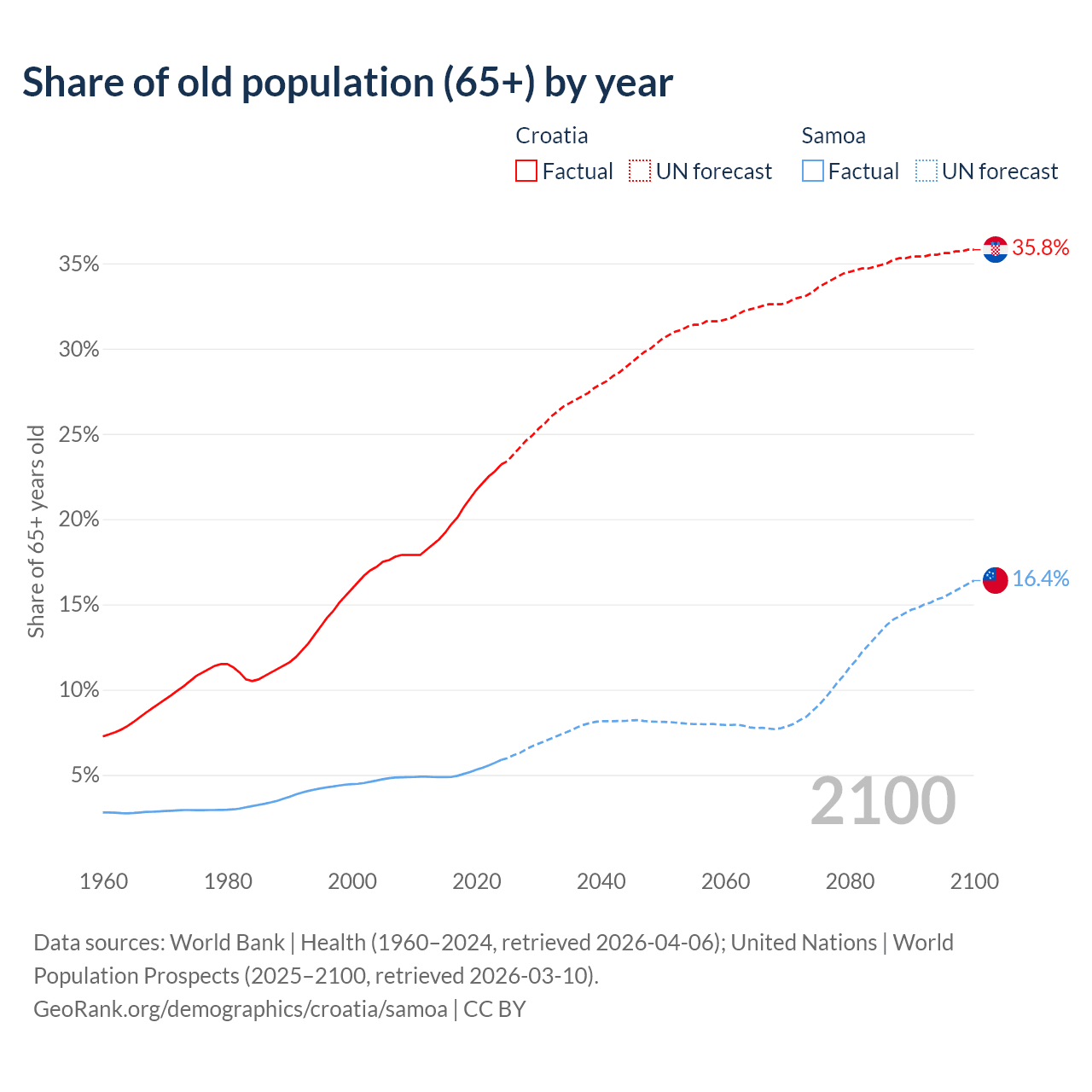 - The share of old-age demographic (65+) in Croatia is 23.2% vs 5.88% in Samoa.