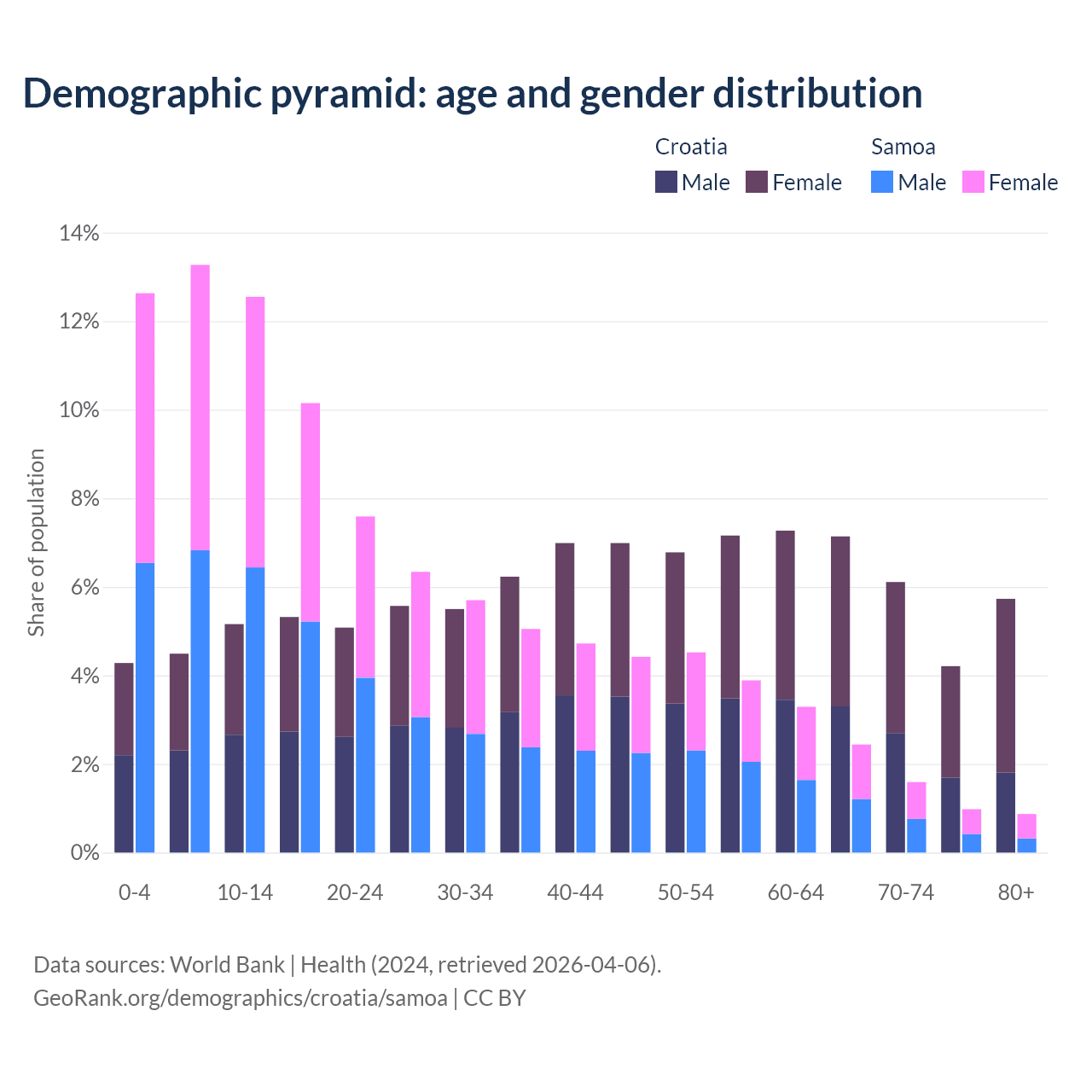 - Croatia is ranked 11/196 by median age (oldest to youngest) vs 158/196 for Samoa.