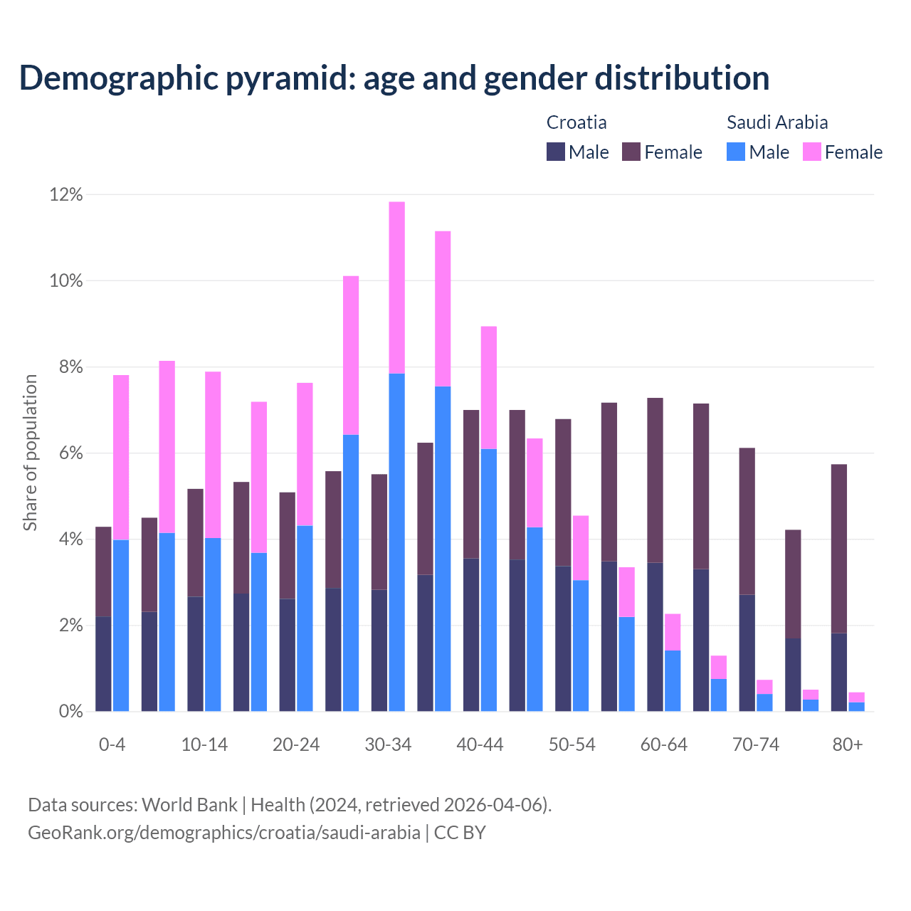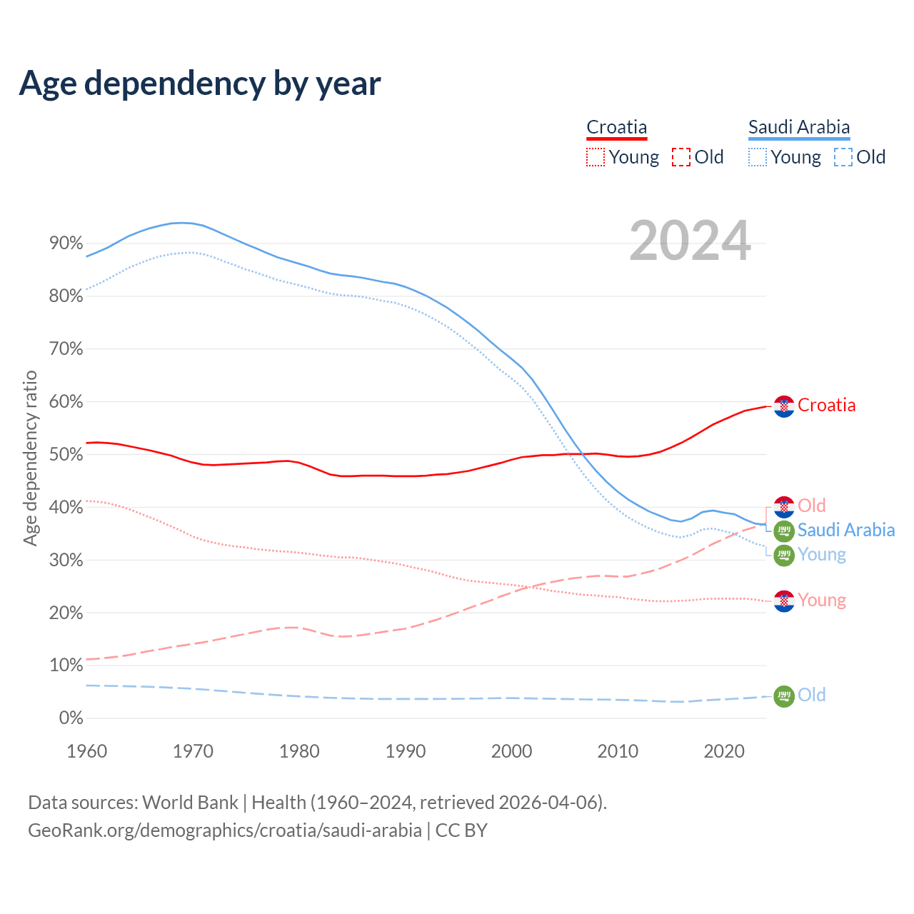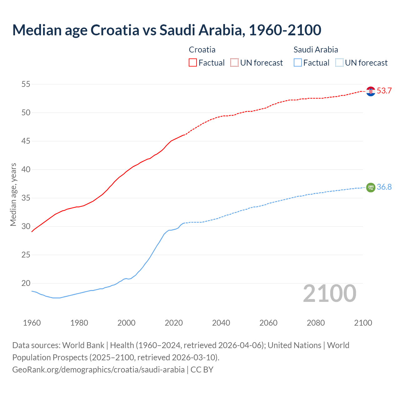 - Croatia is ranked 11/196 by median age (oldest to youngest) vs 98/196 for Saudi Arabia.