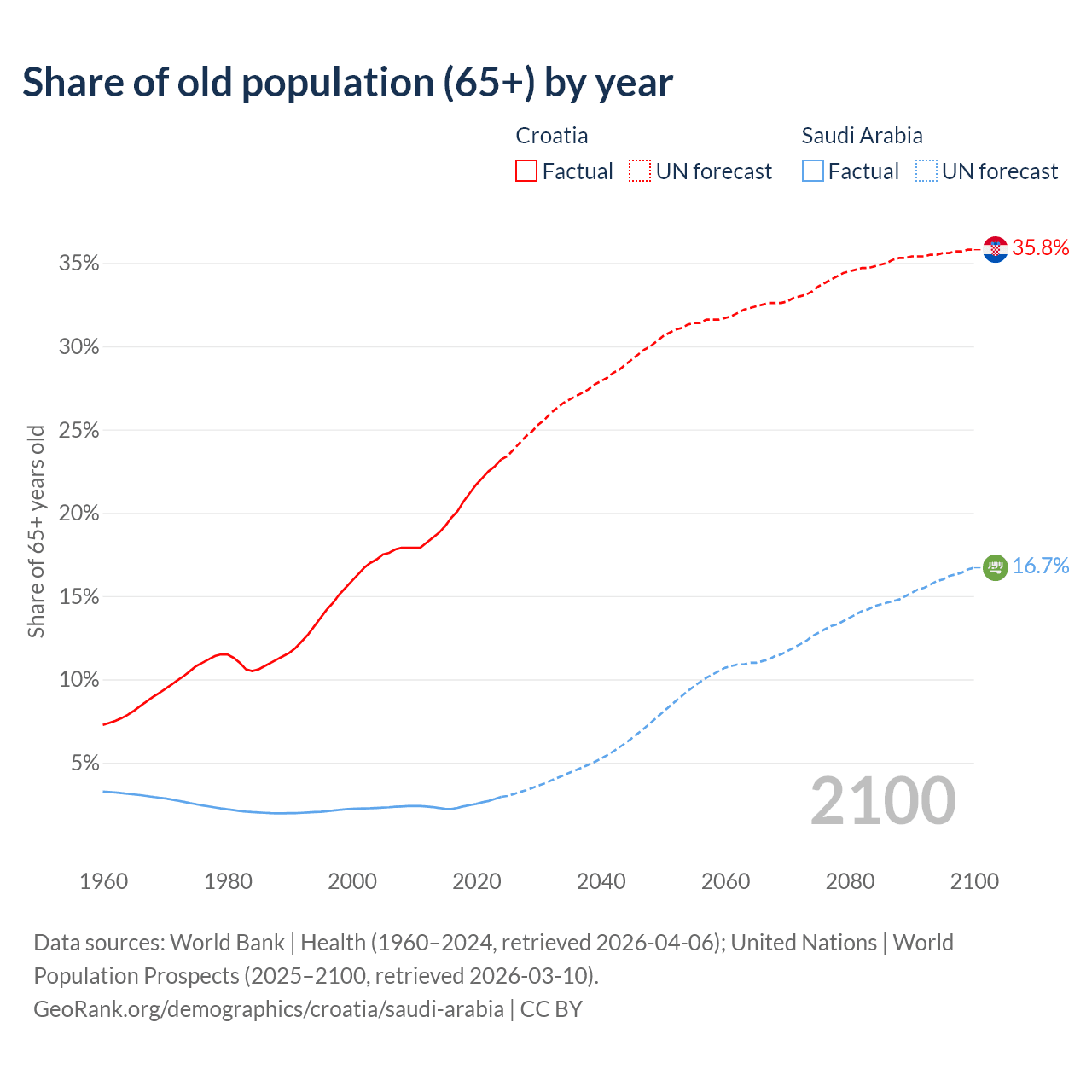 The share of older people aged 65 and over is 23.2% in Croatia and 2.95% in Saudi Arabia. Life expectancy in Croatia compared to Saudi Arabia .
