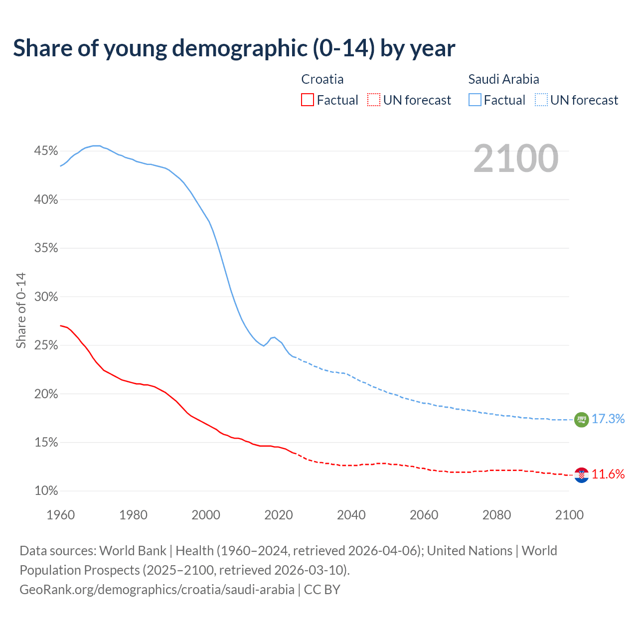 - The share of young demographic (0-15 years old) in Croatia is 13.9% vs 23.8% in Saudi Arabia.