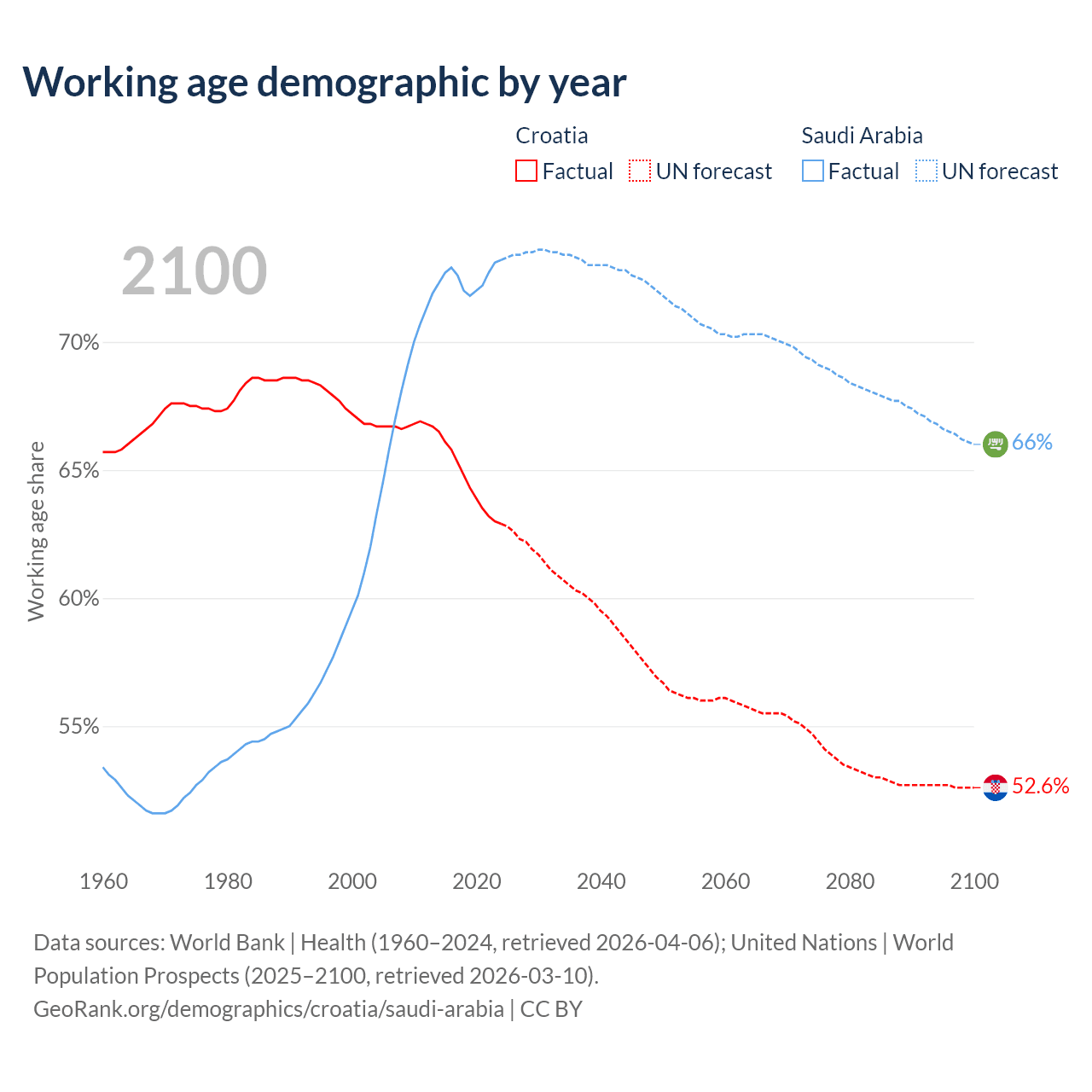 - Croatia has 2.4M working age adults (aged 15-64) vs 26.9M in Saudi Arabia.