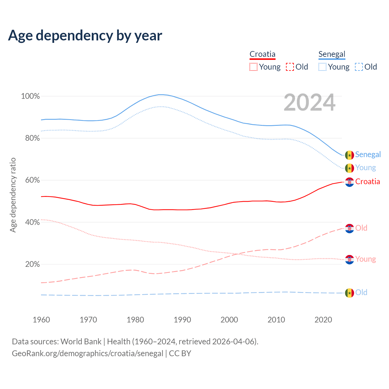- Croatia is ranked 11/196 by median age (oldest to youngest) vs 162/196 for Senegal.