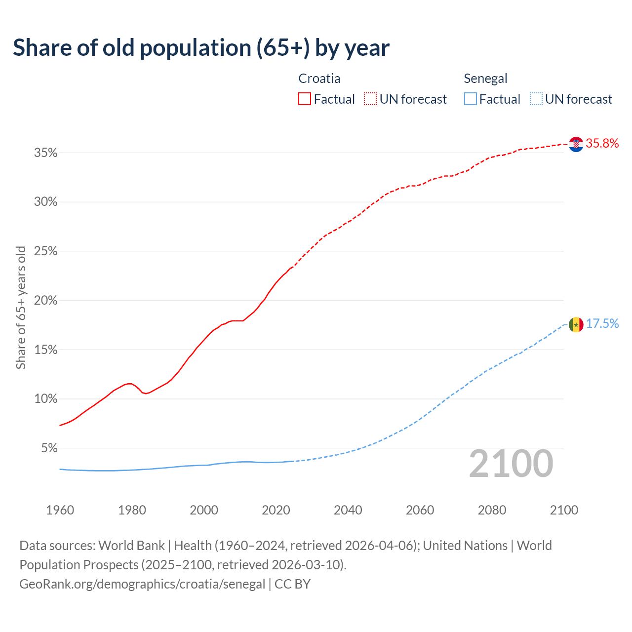 The share of older people aged 65 and over is 23.2% in Croatia and 3.62% in Senegal. Life expectancy in Croatia compared to Senegal .