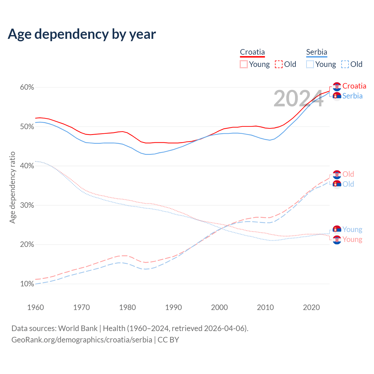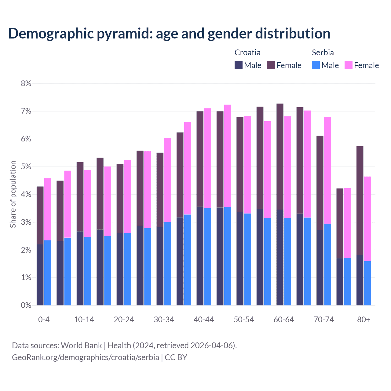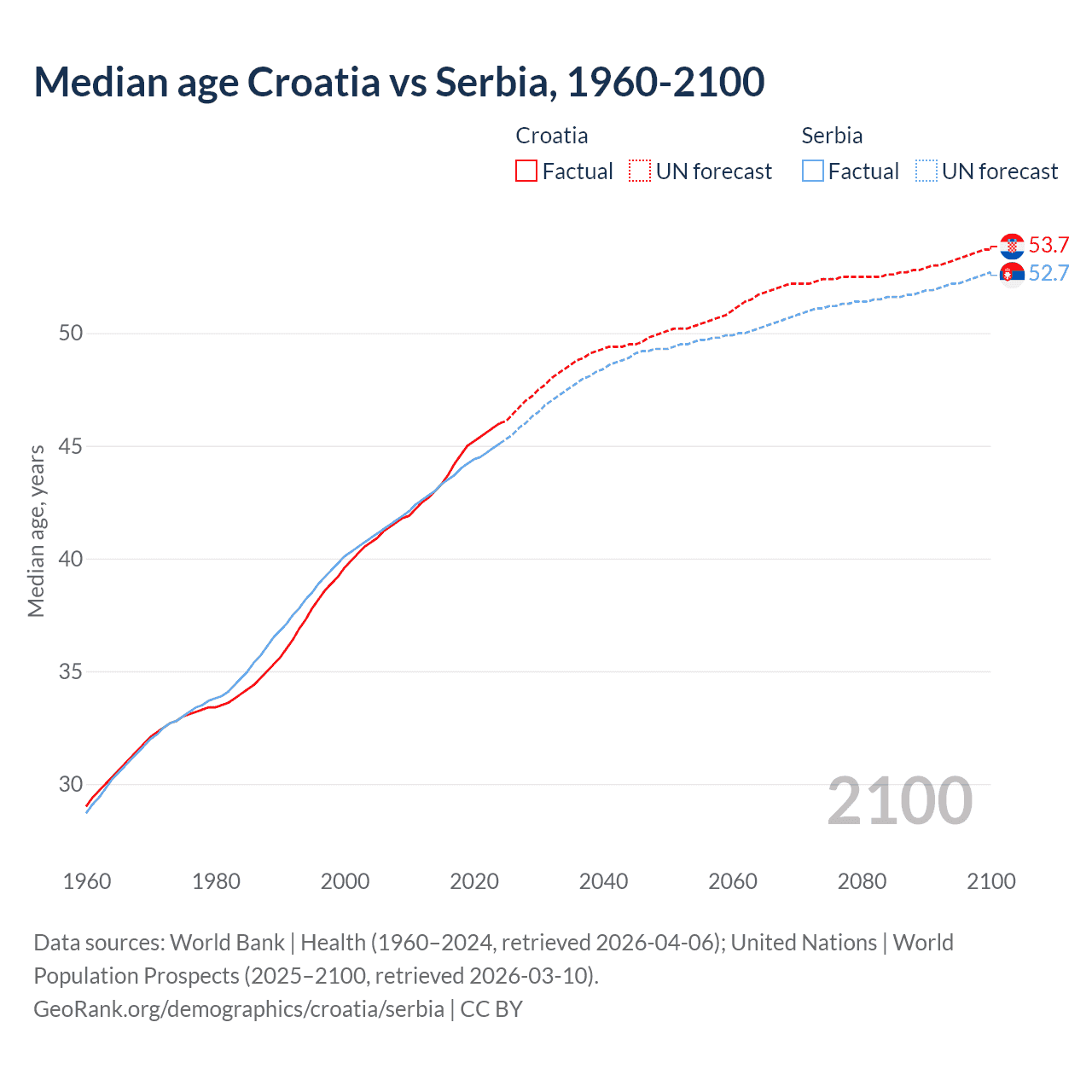 - Croatia is ranked 11/196 by median age (oldest to youngest) vs 15/196 for Serbia.