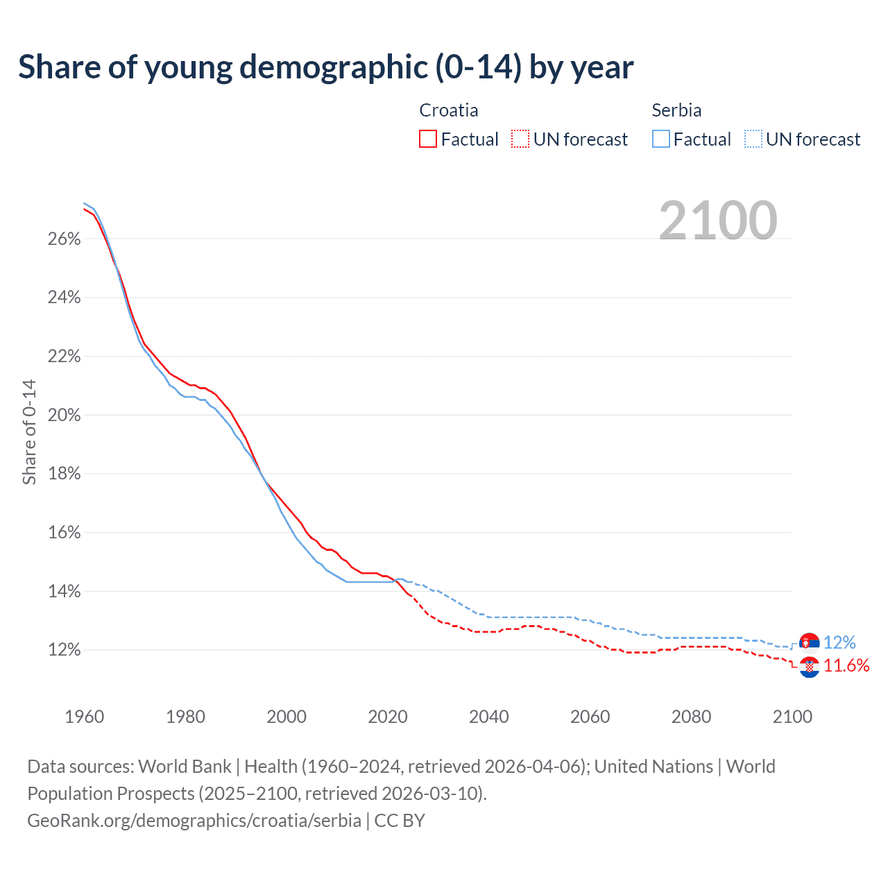 - The share of young demographic (0-15 years old) in Croatia is 13.9% vs 14.3% in Serbia.