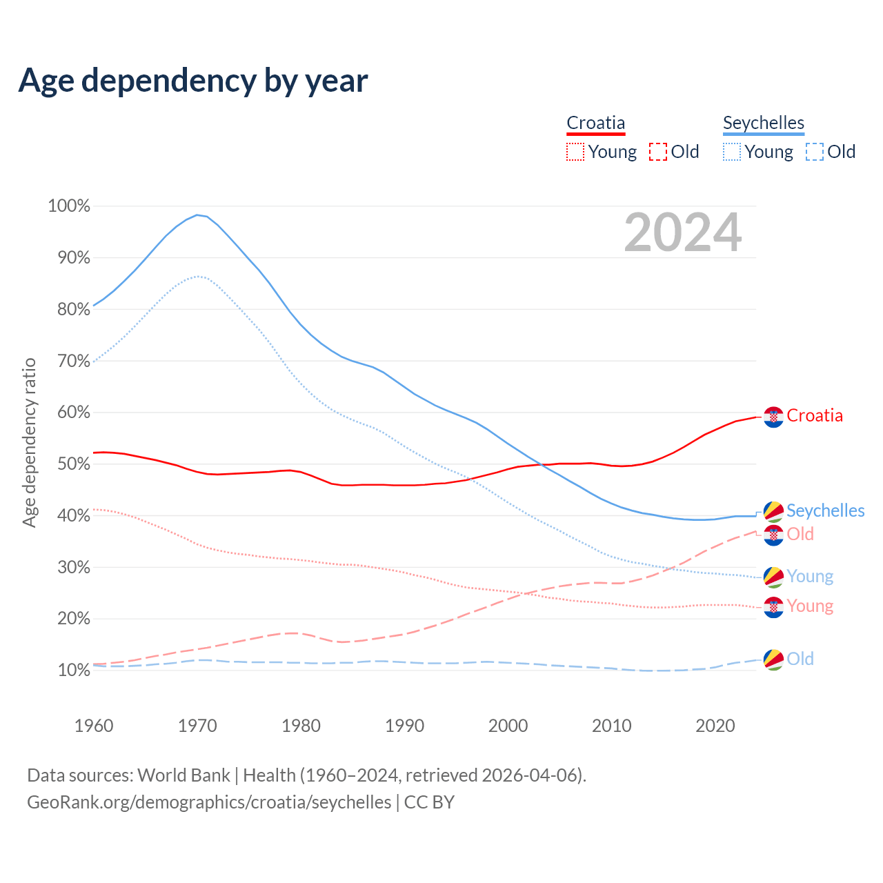 - The share of old-age demographic (65+) in Croatia is 23.2% vs 8.54% in the Seychelles.