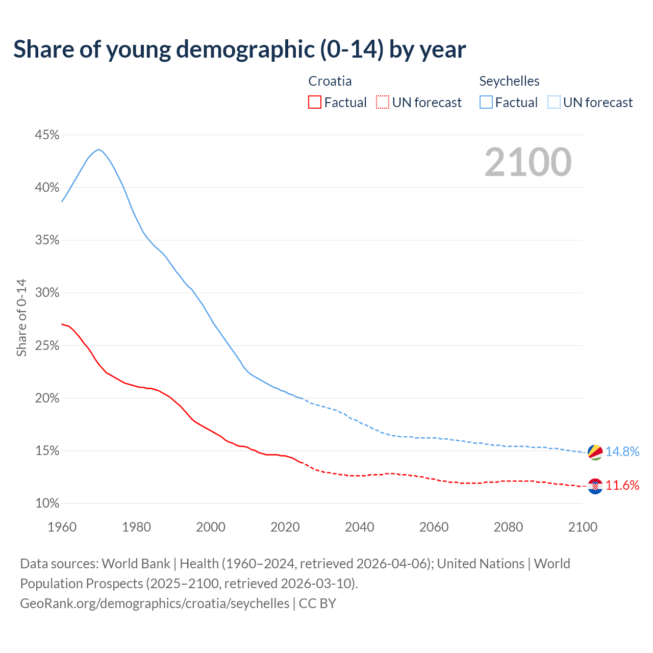 - The share of young demographic (0-15 years old) in Croatia is 13.9% vs 20% in the Seychelles.