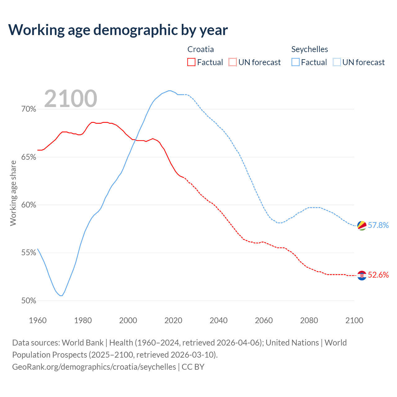 Median age Croatia vs Seychelles, 1960-2100