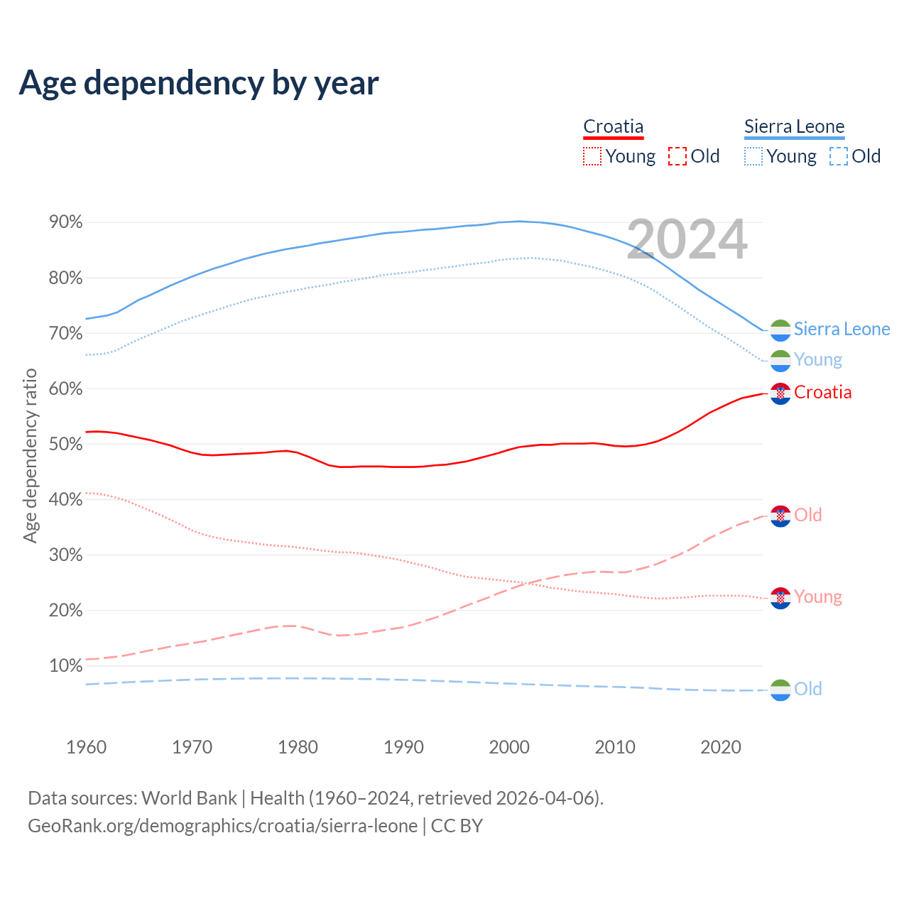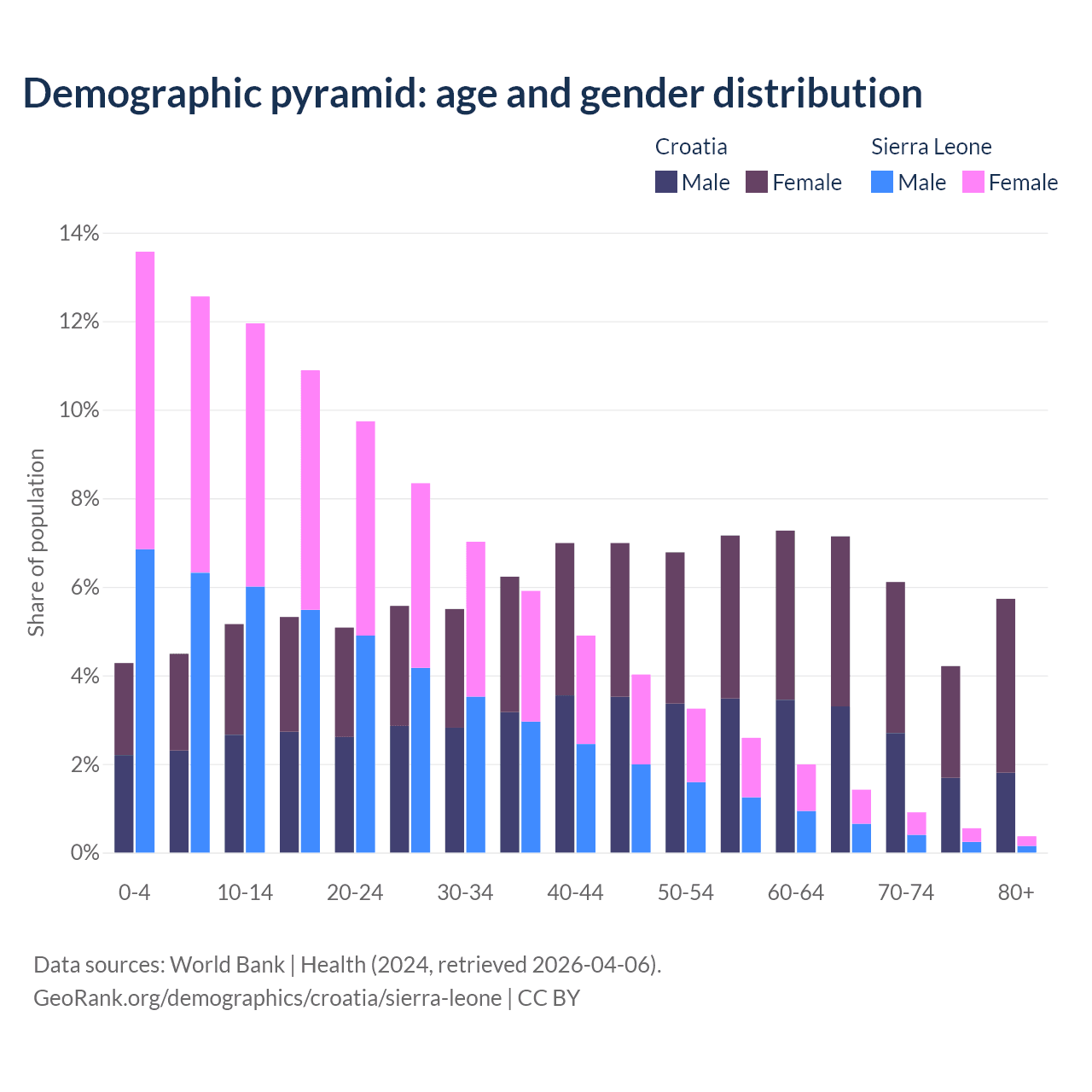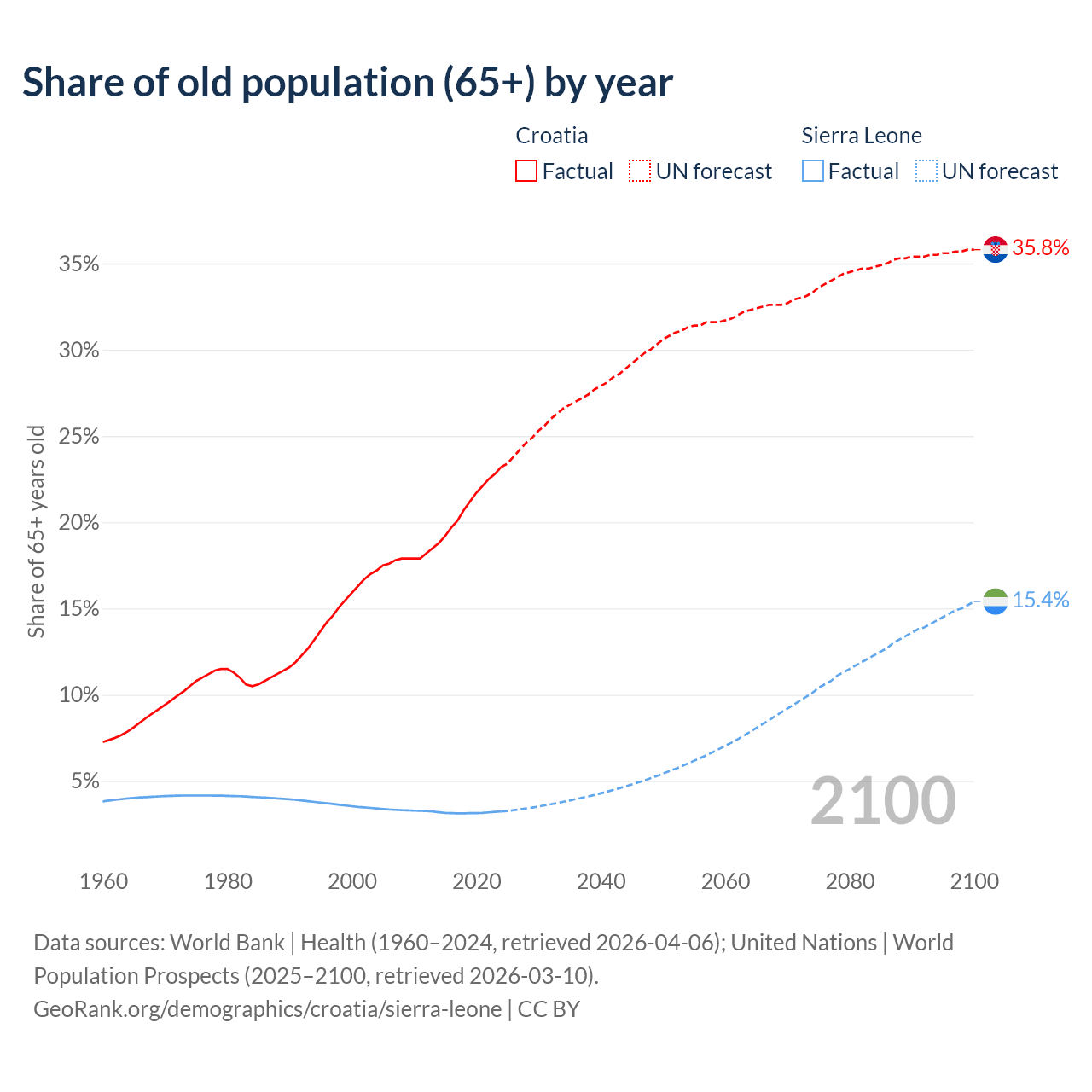 - The share of old-age demographic (65+) in Croatia is 23.2% vs 3.24% in Sierra Leone.